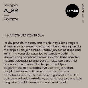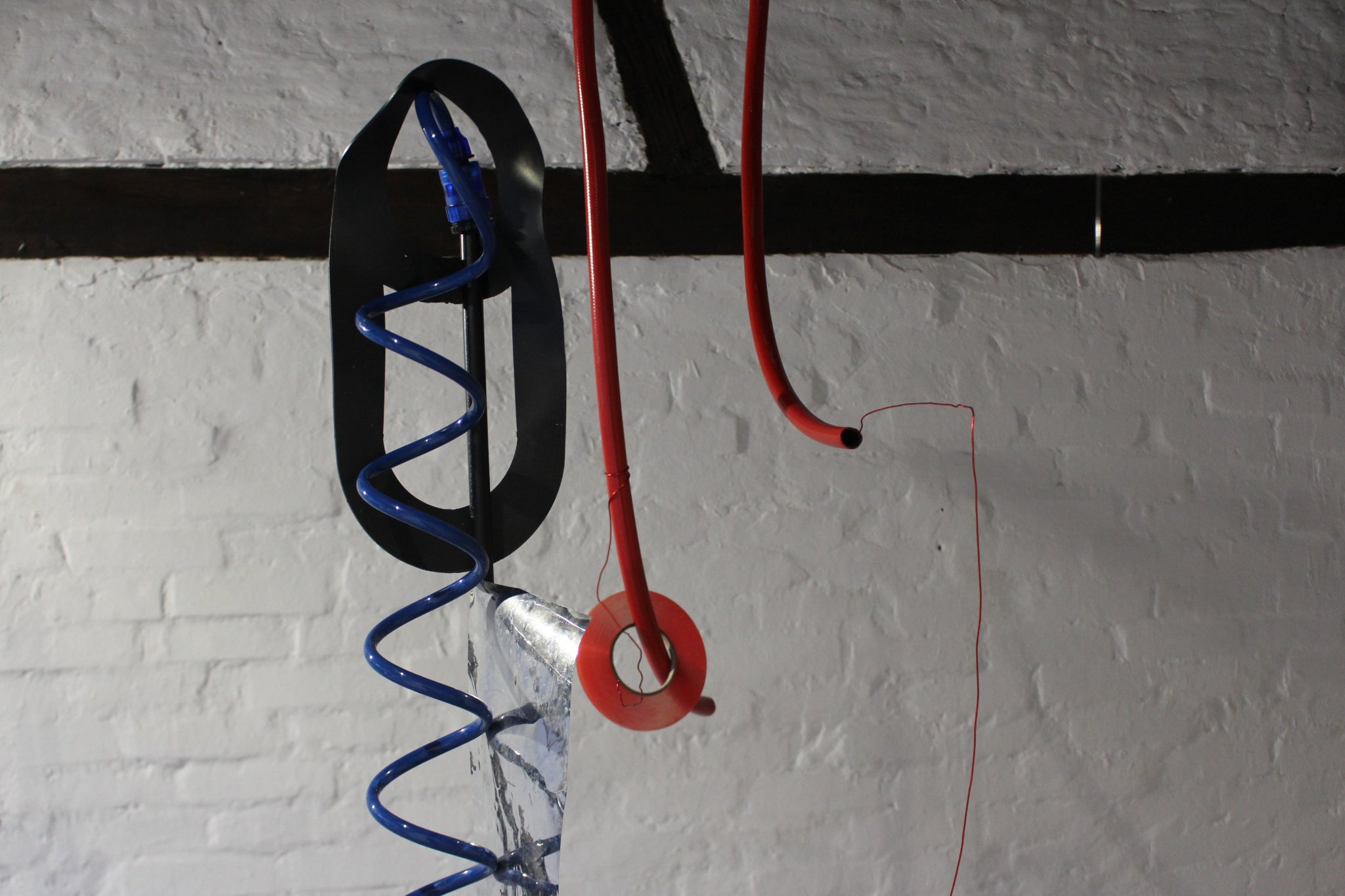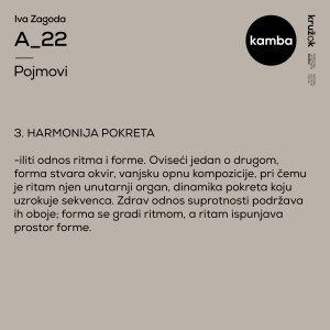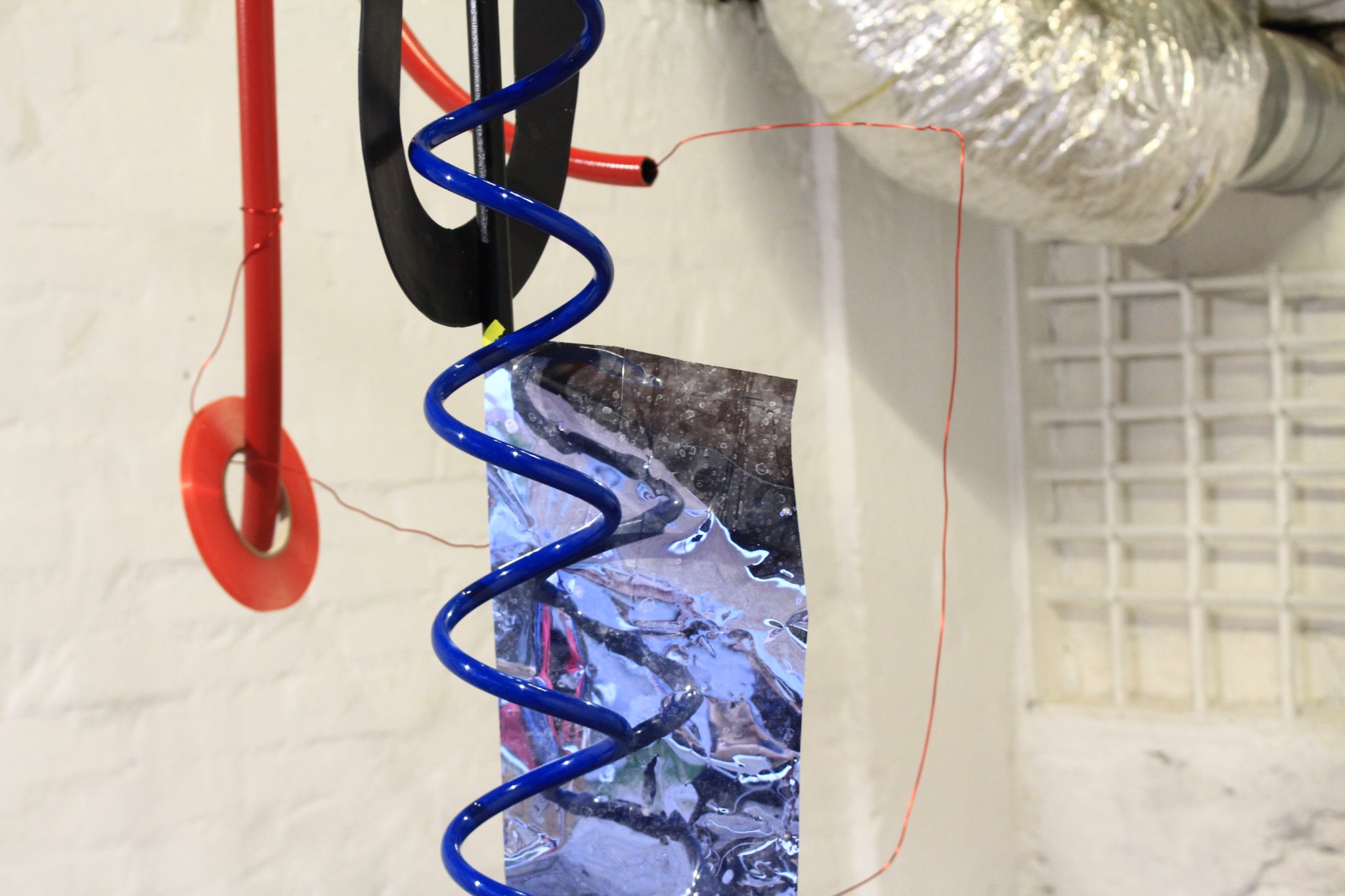 The artworks presented at this exhibition are a continuation of the author’s painting cycle “Zaron”. During her process, the author listens to music, abstracting the harmony of music, showing by color the tone with which the musical sequence begins, while the rhythm is represented by a line. To this author adds: Sequences depicting the works are reflected movements of a part of composition composed of rhythms and tones.” The author conveys her fascination with the movement from the painting to the futuristic installation A_22, which we can see here. By conscious use of non-conventional materials, which contrasts her approach at the cycle’s beginning, her process travels from two-dimensional painting frames into the world of a mobile, but even there certain rules apply and some control is imposed. The author raises the synergy of rhythm and form to the next level with her mobiles: the pictorial line poured into physical materials, such as a pipe, still carries rhythm, but in the artwork, a tone is also felt through a color.