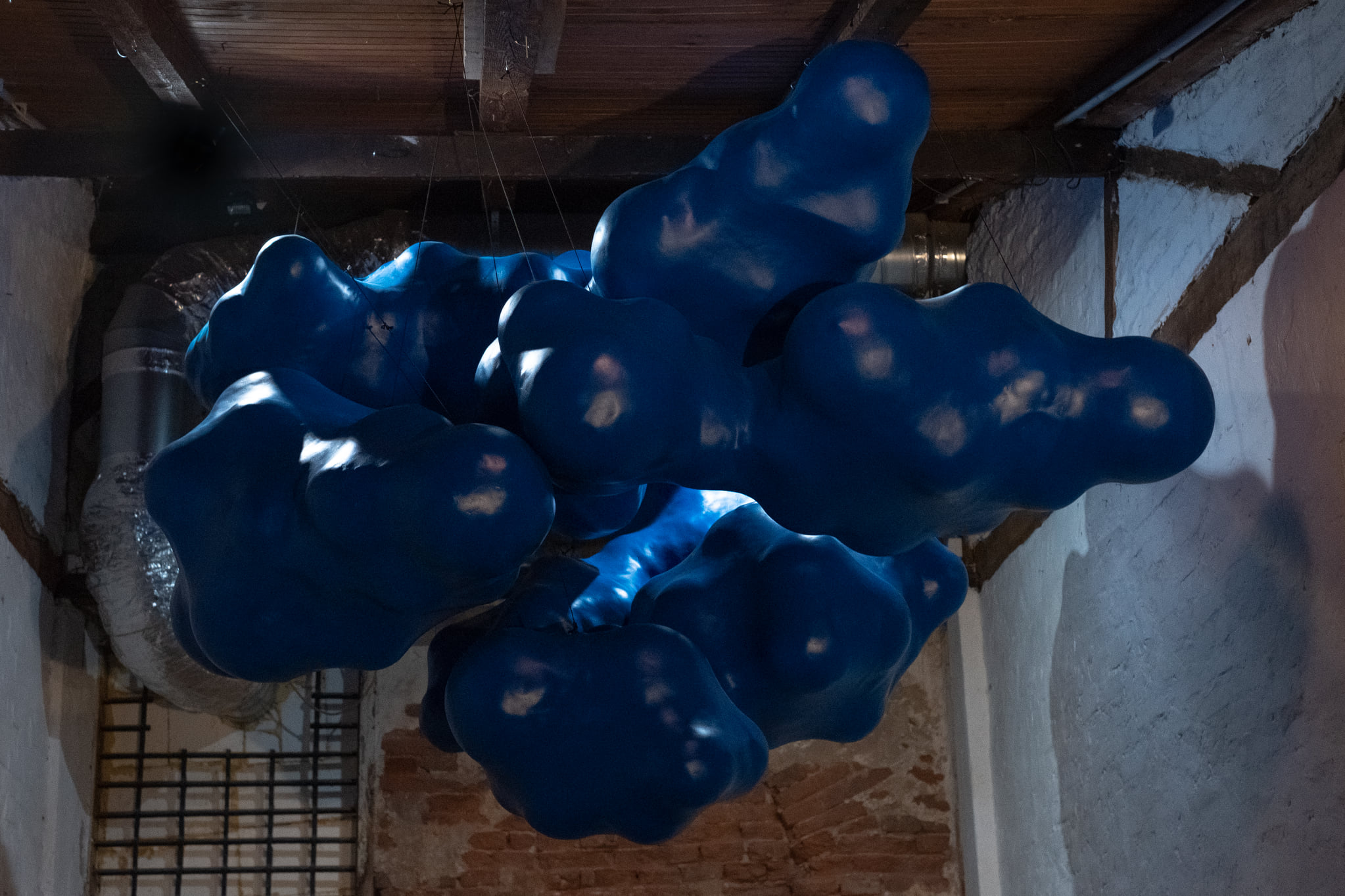 The general term accumulation means putting something on a pile, in the hydrological context it refers to artificial lakes intended to meet the needs of users (water supply, irrigation, etc.), while in economic terms it means financial gain, i.e. the income remaining after deduction of consumption, which is stored as savings or as an investment for the purpose of economic gain. Accumulation in the sculptural sense of Matej Vuković evokes blue stylized clouds, located in the courtyard of Ilica 37, in front of and inside the exhibition space, originally in the function of a repository. The organic forms associated with water clusters actually form an empty volume given that their basic shape, i.e. interior, is achieved by joining inflated balloons, wrapping them in cellophane, dressing them in fiberglass and finally applying glass mat and polyester. The use of artificial material, the lack of internal content of sculptures and ultimately their accumulation, associatively lead to unnecessary overproduction of insatiable capitalist demand, warning of the unsustainability of continuous exploitation and its consequences, which in the long run prevents further progress and development. Faced with recent crises and a prevailing sense of existential fear, in addition to the material piling, there is also emotional accumulation, which leads to unreasonable and ineffective attempts to avoid unpredictable situations. Inverted clouds that stand upright on the ground also insinuate the absurd and vain need for the accumulation of various objects, finances or information that exceeds the needs of the individual, while questioning the meaning of man’s unsatisfied tendency to accumulate.