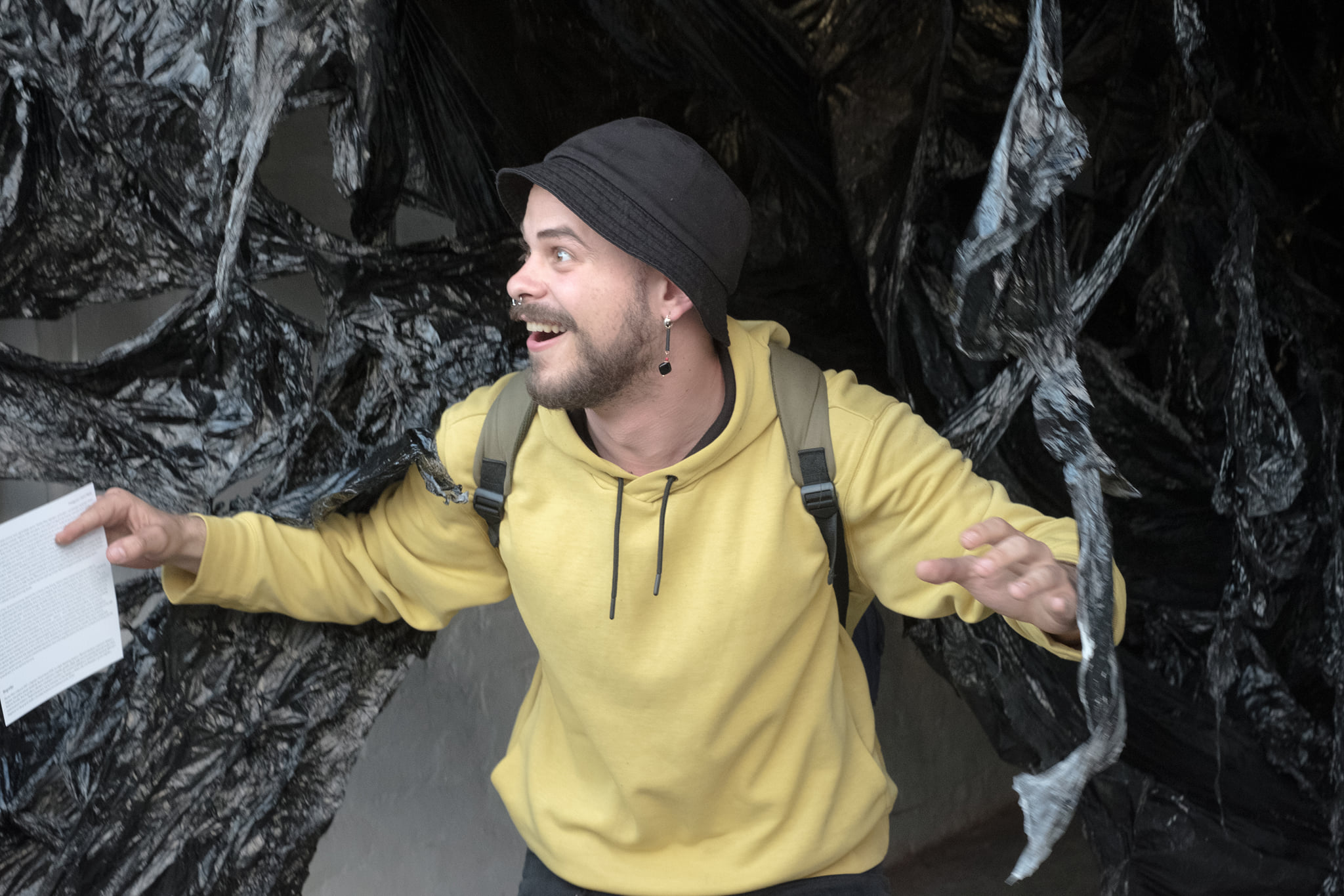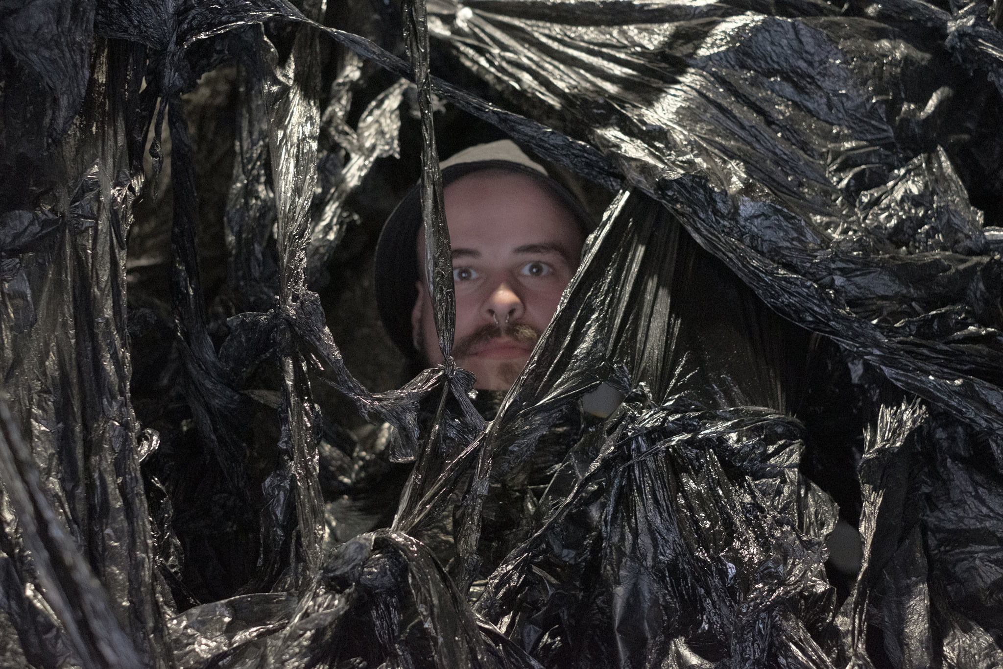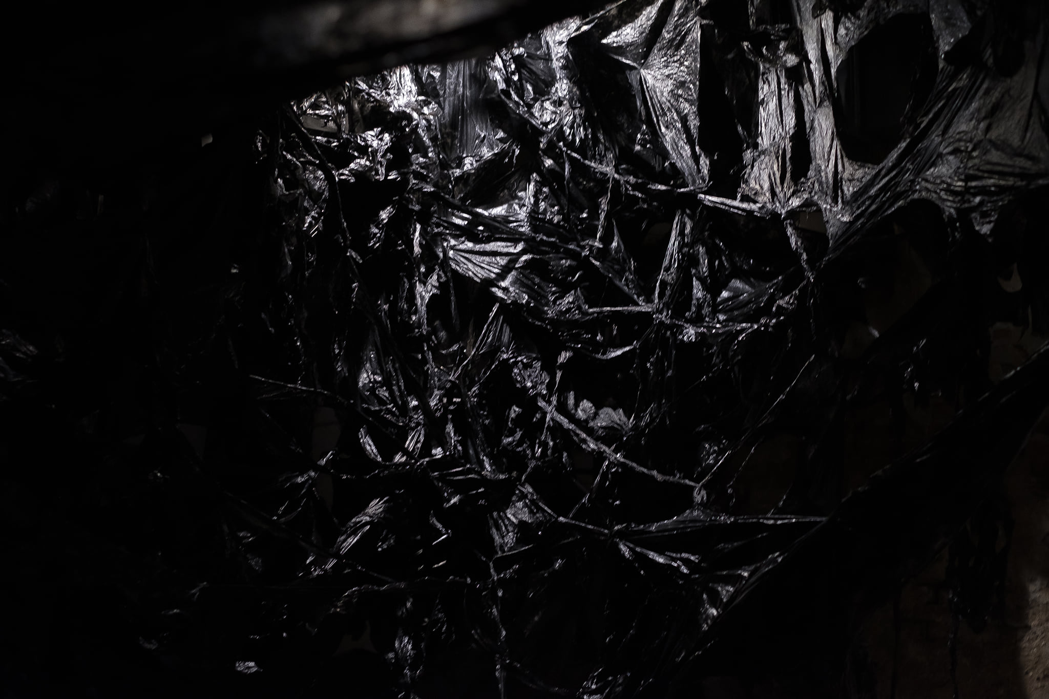 Stepping out of two-dimensional planes, beyond the confines of the frame, Monica Milas creates black plastic bodies of metaphysical significance by tearing, creasing, stretching, and merging. Soft foils soaked in black ink allow the creation of free forms made due to instant inspiration that establishes direct communication with the surrounding space. Each component in the combination of the colour red, green, and blue through the RGB model can vary from a maximum value, to an initial zero — 0, 0, 0, decimal, or 000000 hexadecimal — that results in black. The colour black is a consequence of the absence or complete absorption of light in the visible spectrum, which is paradoxically transmitted and redirected on the smooth surfaces of plastic stretchable forms, making the apparent blackness of the newly created ambience transparent and reflective, bringing it into a sort of negation on a physical and figurative level. The meaning of the title of the exhibition At Zero also refers to the point zero of existence, to the very beginning or to the term of the ancient philosopher Anaximander – apeiron – which denotes the boundless, indefinite and infinite. The unformed primordial substance is materialized by an translucent, elastic and resistant black plastic mass, as a kind of ontological research experiment with the medium in its temporary time-space determinant. The indefiniteness of the apeiron represented to the Pythagoreans its almost negative property, just as in the traditional philosophical sense the aesthetics of the ugly was represented by that which has no form of its own, which deviates from cosmic harmony. Monica Milas’ asymmetrical, amorphous, deformed black foils oppose idealized beauty by imitating an imaginary pracosmic cobweb, forming a waste that becomes a spatial canvas, a material of existential expression that cosmologically places the distortion of ideals and infinity into the embodiment of a new spiritual harmony.