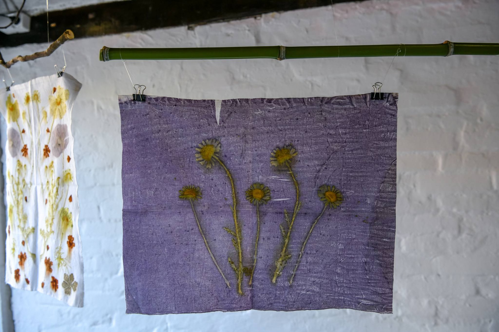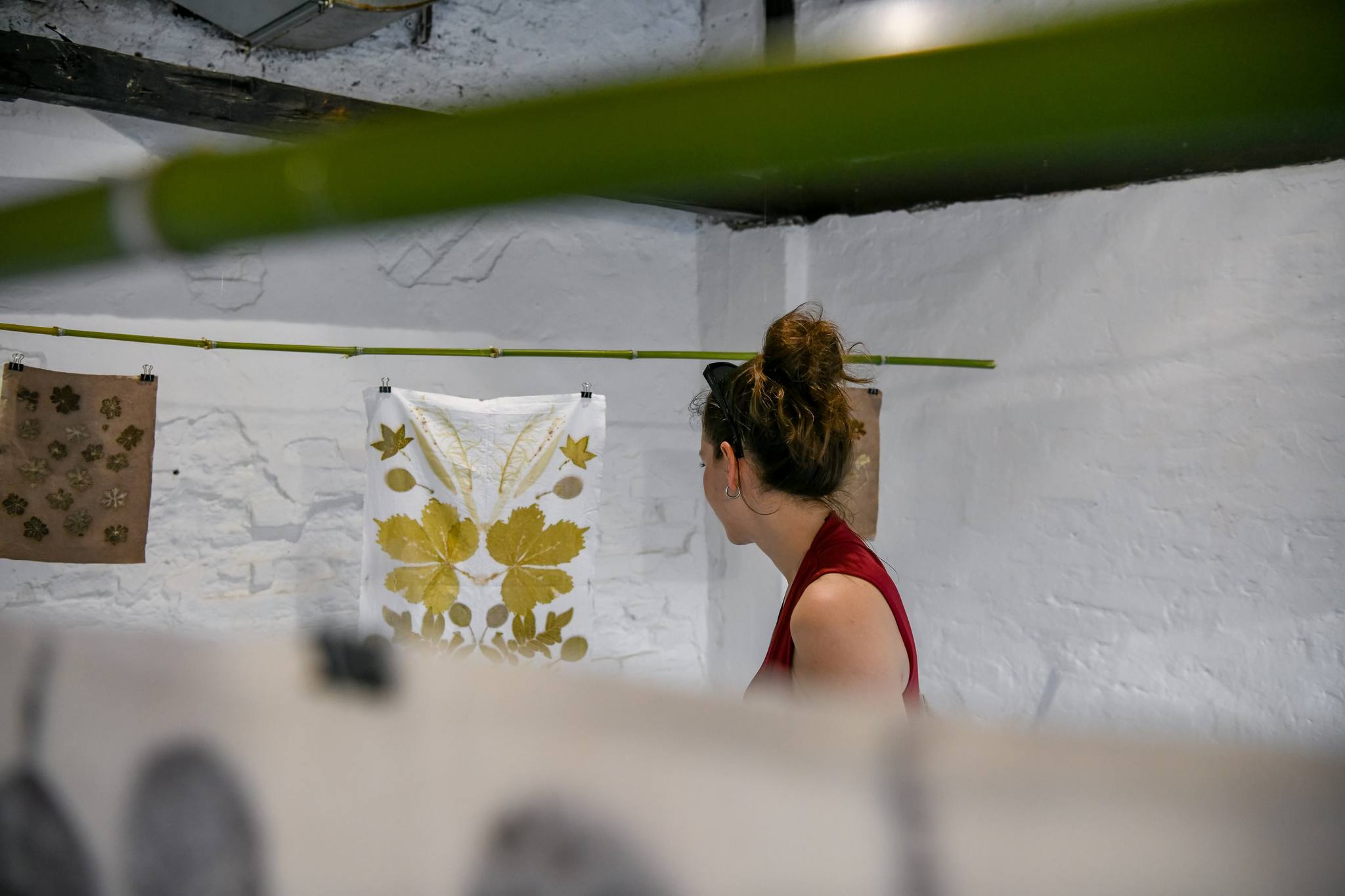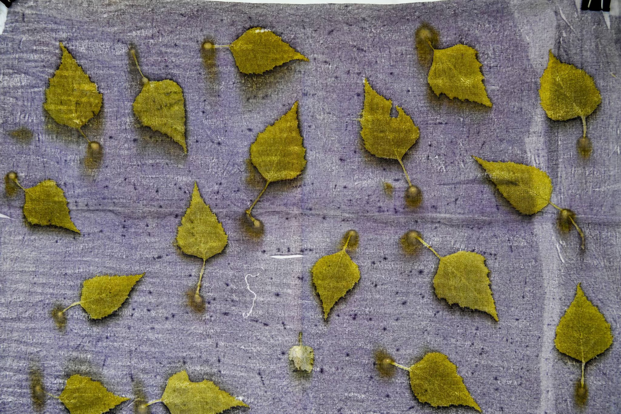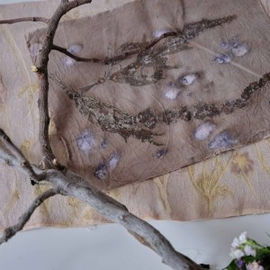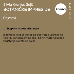 The works from the series Botanical impressions from the author Silvia Kranjec Gajić are examples of works made from one’s own volition and investment of free time into personal development supported by neighbors from the natural environment. Work created by the principle of μεράκι, from one’s desire, have the characteristics of pre-manufactural works: before works were separated (alienated) and put on an assembly line, its author had to be highly artistically and technically skilled. Fabric painted by plants, using the ecoprint technique requires of its author a hand that has been trained over time and that skillfully masters the balance of art and technique. This type of product requires and is explicitly focused on the process which separates it from mass production and makes it long-lasting, more valuable and unique, as can be seen in the extreme precision of the author’s works, some of which give the impression of hyperrealist painting- thus confirming the author’s refinement and dedication to each canvas individually. The principle of μεράκι also opens the gates to experimental methods. This introduces a dose of unpredictability which further enriches the final product; the creation of a perfect composition on fabric by a human hand is possible, with subsequent processing and the action of plants, the inhabitants of nature will create their own unique composition on the canvas, according to their own rules, which evokes a sense of surprise in us (humankind).