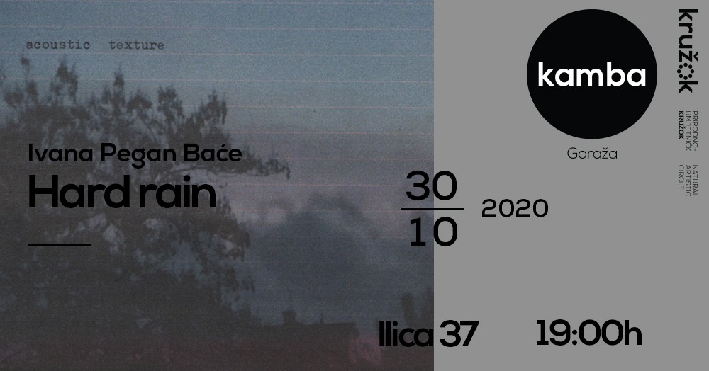 Audio installation Hard Rain by the artist Ivana Pegan Baće is an atmospheric composition which, taking the title and excerpts from Bob Dylan’s ballad A Hard Rain’s a-Gonna Fall, contemplates the causes and consequences of the processes of living and the impossibility of returning to the beginnings of past actions.