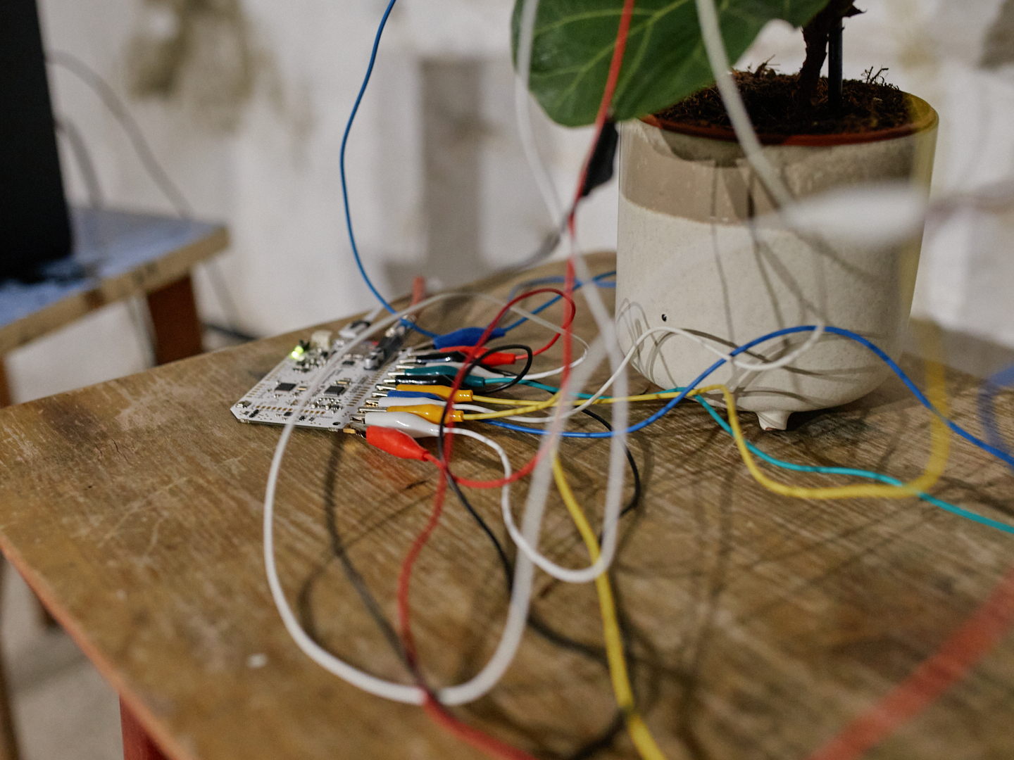 I don’t like whiskey, and I’m not particularly fond of furniture either. The first time I came to her apartment, I liked that piano because it sat awkwardly at the end of the room, seemingly obsessed with half-empty bottles, leaping cats, a broken record player amplifier, and the occasional plant. While Sarah was out, I recorded the sounds of tapping, hitting, strings tightening, and scratching inside that worn-out sound buffet box. Later, those recordings were modulated with the intention of creating usable sound structures from what seemed like a lifeless, unusable object. The result is what you’re hearing now. I took the plant whose leaves activate sound off the piano while Sarah wasn’t looking. The light sensor is there so you can bring someone along. It could have done without it.