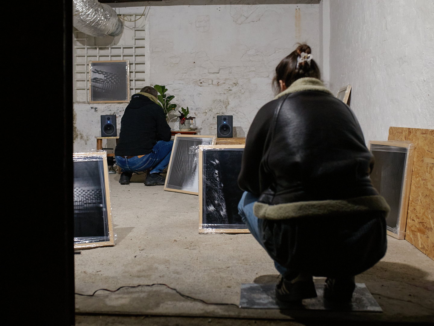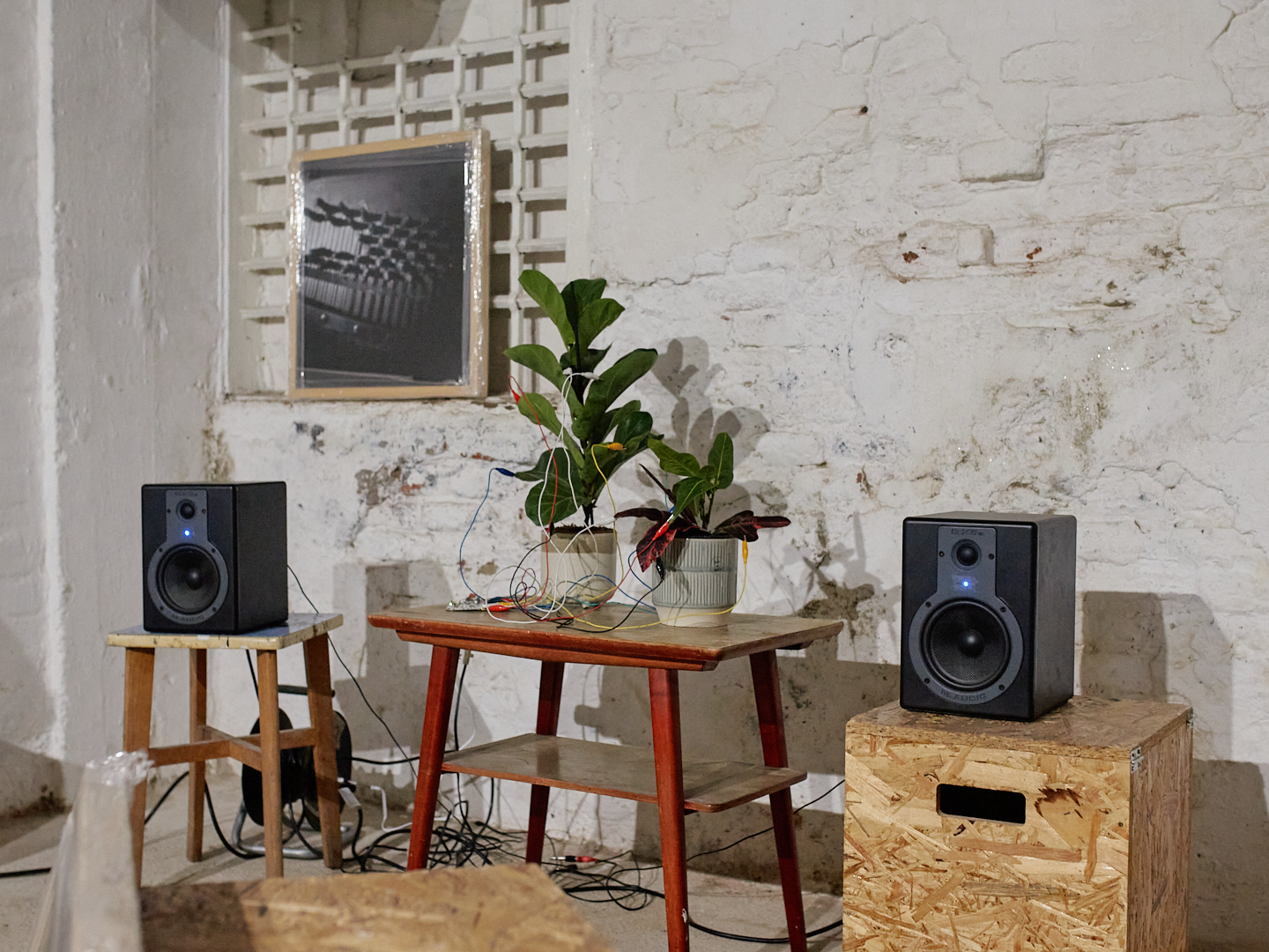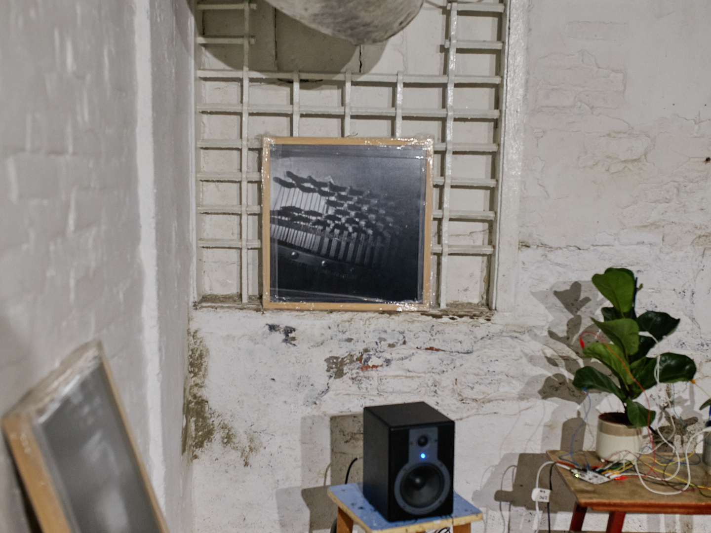 An interactive sound installation for two visitors consists of the manipulation of twelve audio recordings from an abandoned piano on Markgraf-Rüdiger Street in Vienna, using the software: Grainscape, Ribbs, Petri, Sapling, Usine. The recordings are activated by touching the plant’s leaves. Twelve photographs of the piano’s interior were taken with a pinhole cardboard camera using worn-out Potsdam black-and-white film. The duration of each exposure corresponds to the length of a specific sound recording. To view/listen to the installation, you need to bring someone with you who will stand on the sensor that triggers the light.