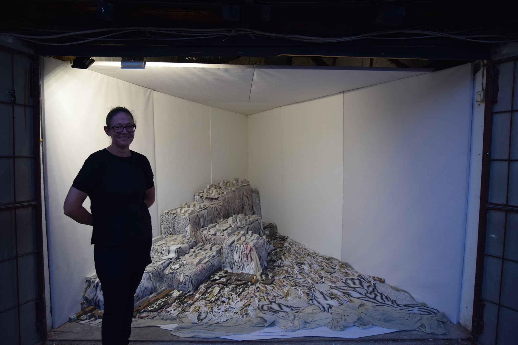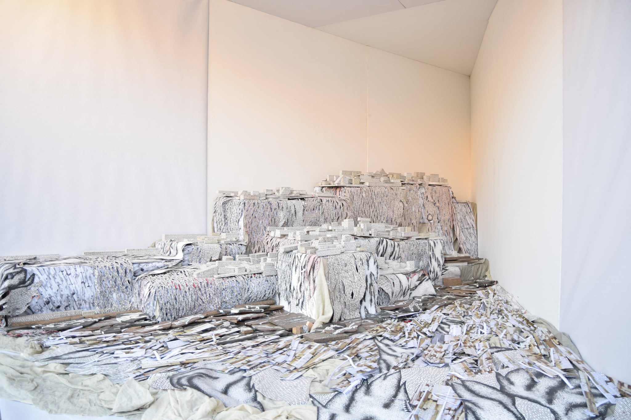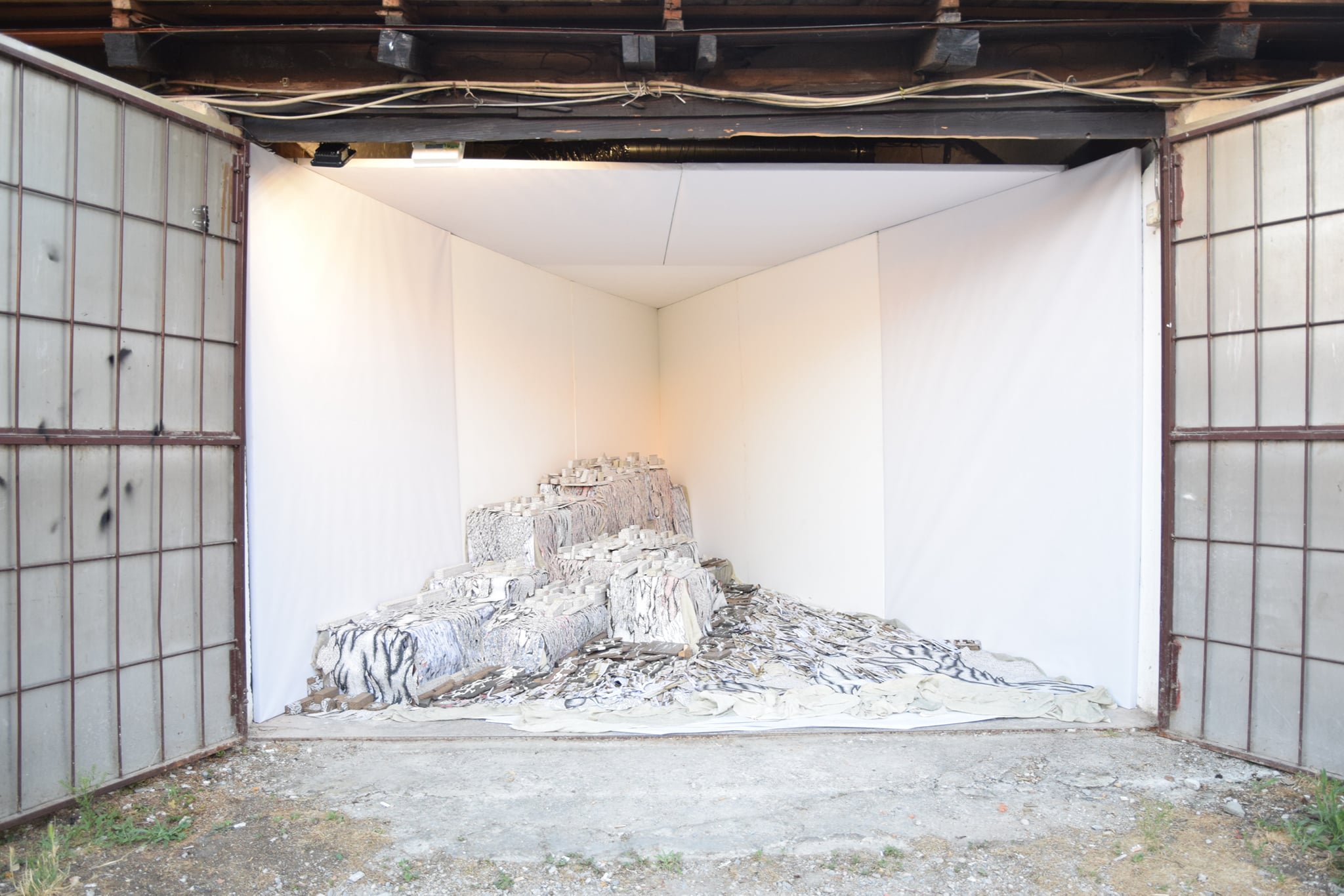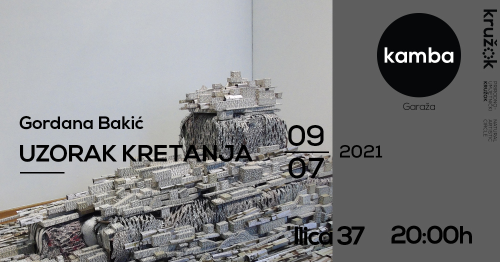 By arranging various fragments such as pieces of canvas, slats, plastic, paper and other, often waste, line-drawn materials, Gordana Bakić achieves a visual movement of work towards the viewer whose perception she subtly plays with. The artist stores elements of the work like fragile parts of personal memory, and by reusing these building materials in different circumstances, their recontextualization is achieved, while opening to the fluidity of interpretation. The author continuously re-examines space, physical and mental, creating almost surreal landscapes or, as she calls them – mental dioramas – while turning the gallery into a sliding determinant between an exhibition and work space. The combination of an ambient installation and a spacious drawing gives an insight into the intuitive creative flow of the author who, in complete contrast to the hectic way of life and work, patiently like a weaver, arranges meticulous elements creating a monumental balanced whole. In the previously realized works (Regeneration, Current Spaces, City Iconography II 1950-2000+, City Visions), but also in the materials she uses, the author’s experience of working as a theater set designer is recognized. With a deep understanding of space, evident also through the subtle fusion of light and shadow, and a balanced gradation of materials, she achieves a cohesion of work with the environment, while giving the impression of a theater stage moving. The specificity of Gordana Bakić’s work is manifested in its transformativeness, through different meanings, but also through the spatial ability of constant biomorphic adaptation to the environment in which it is located and slowly takes over, while her role is intertwined between artist and builder of magical worlds.