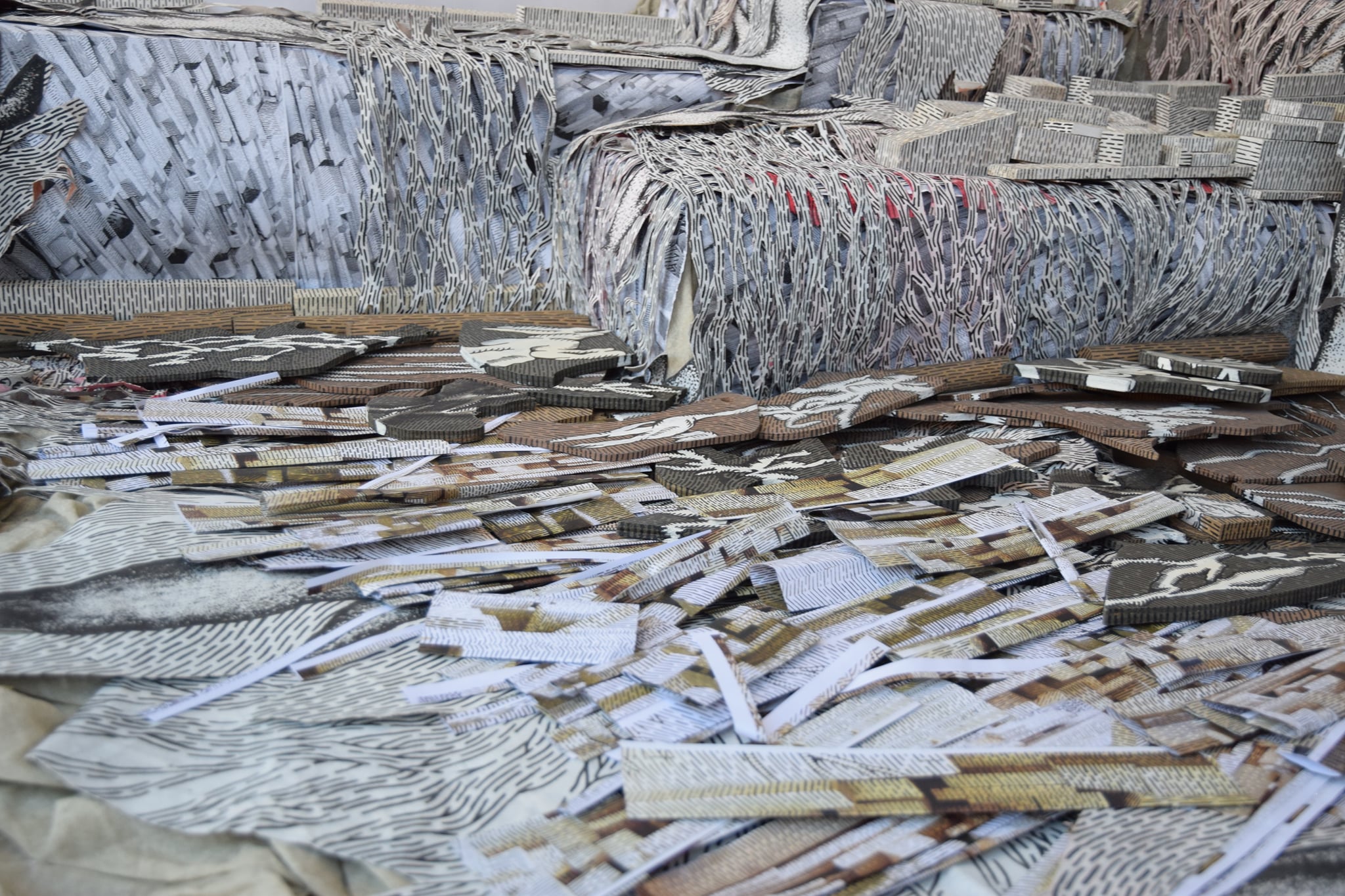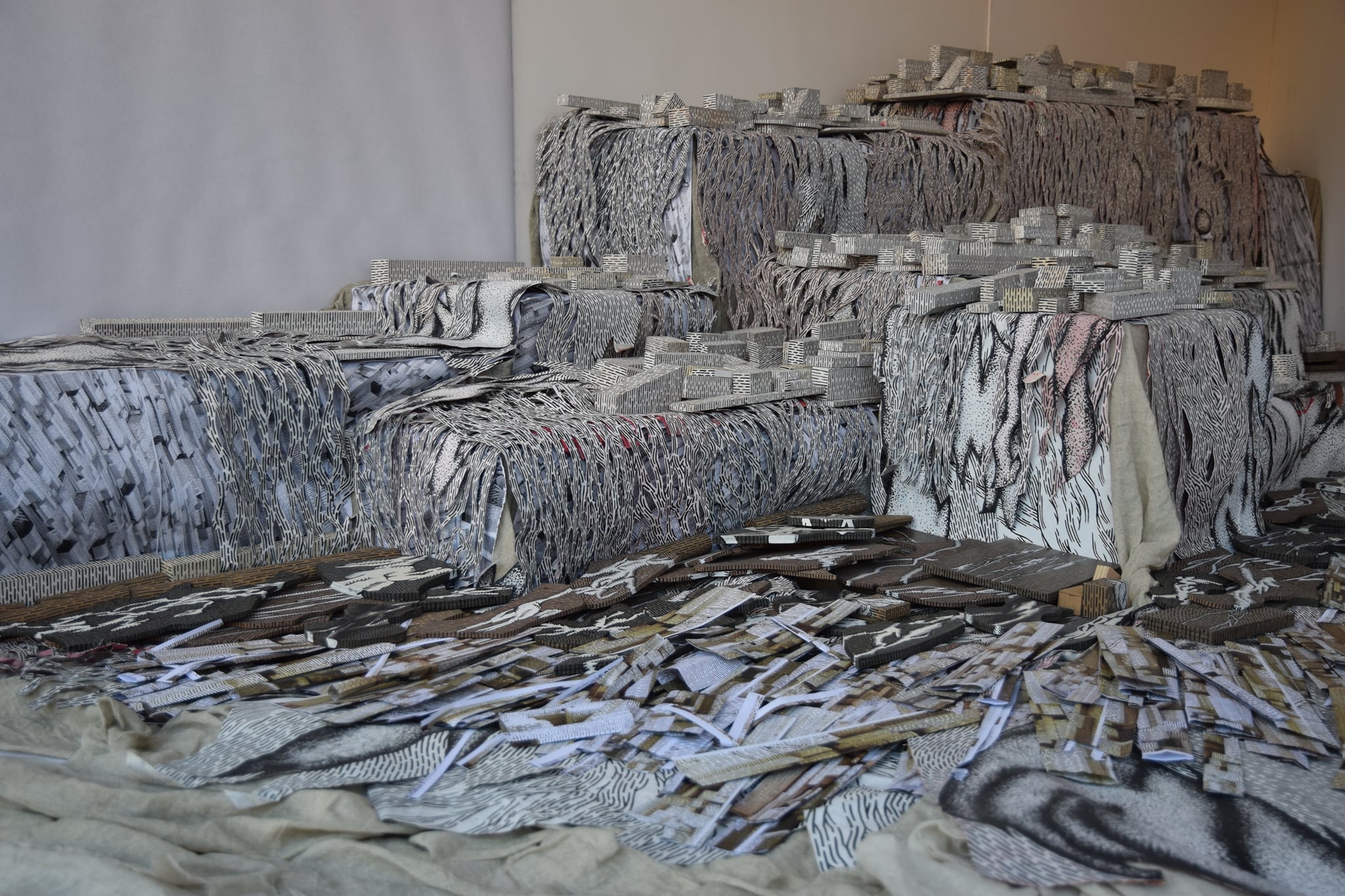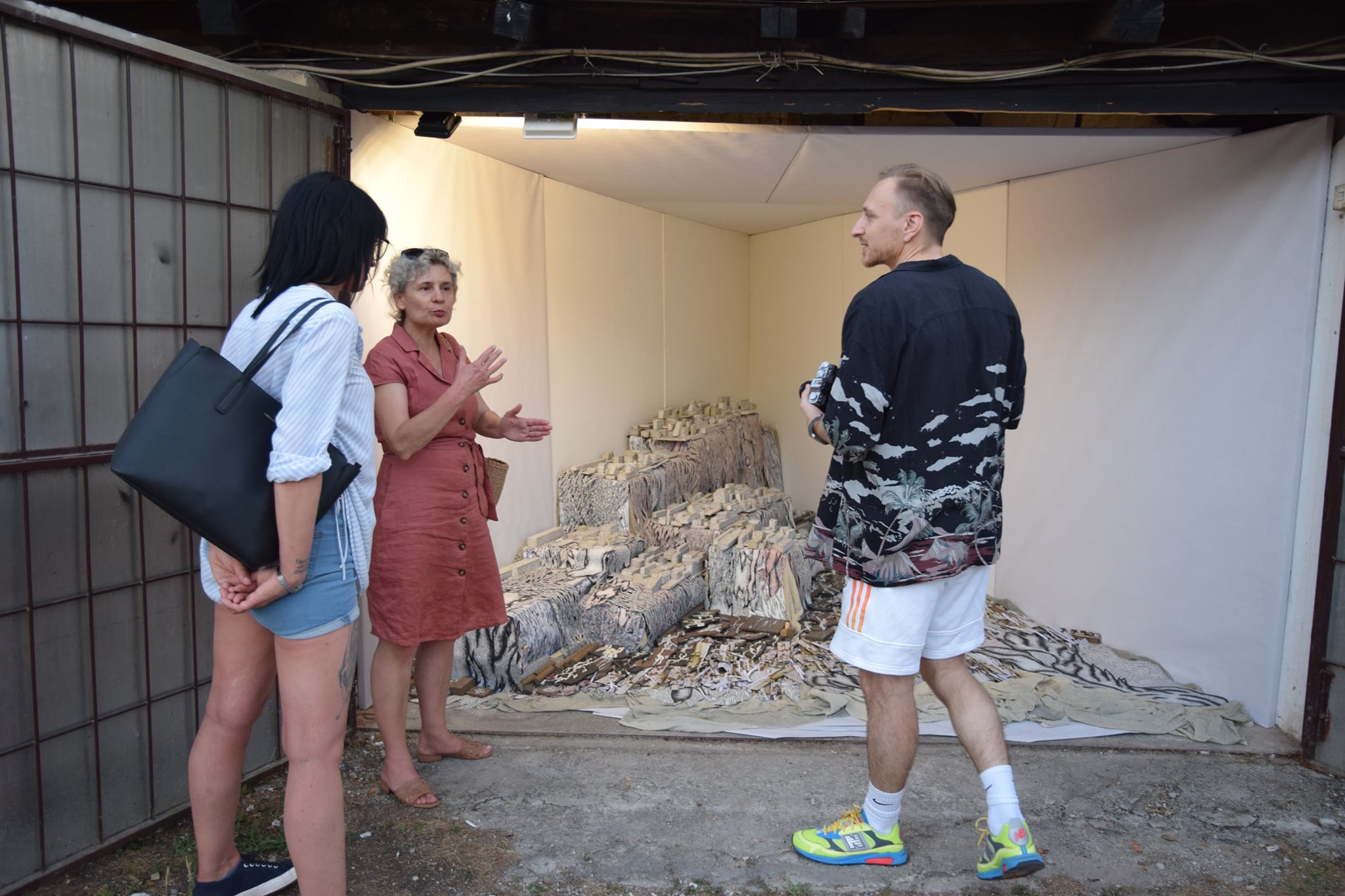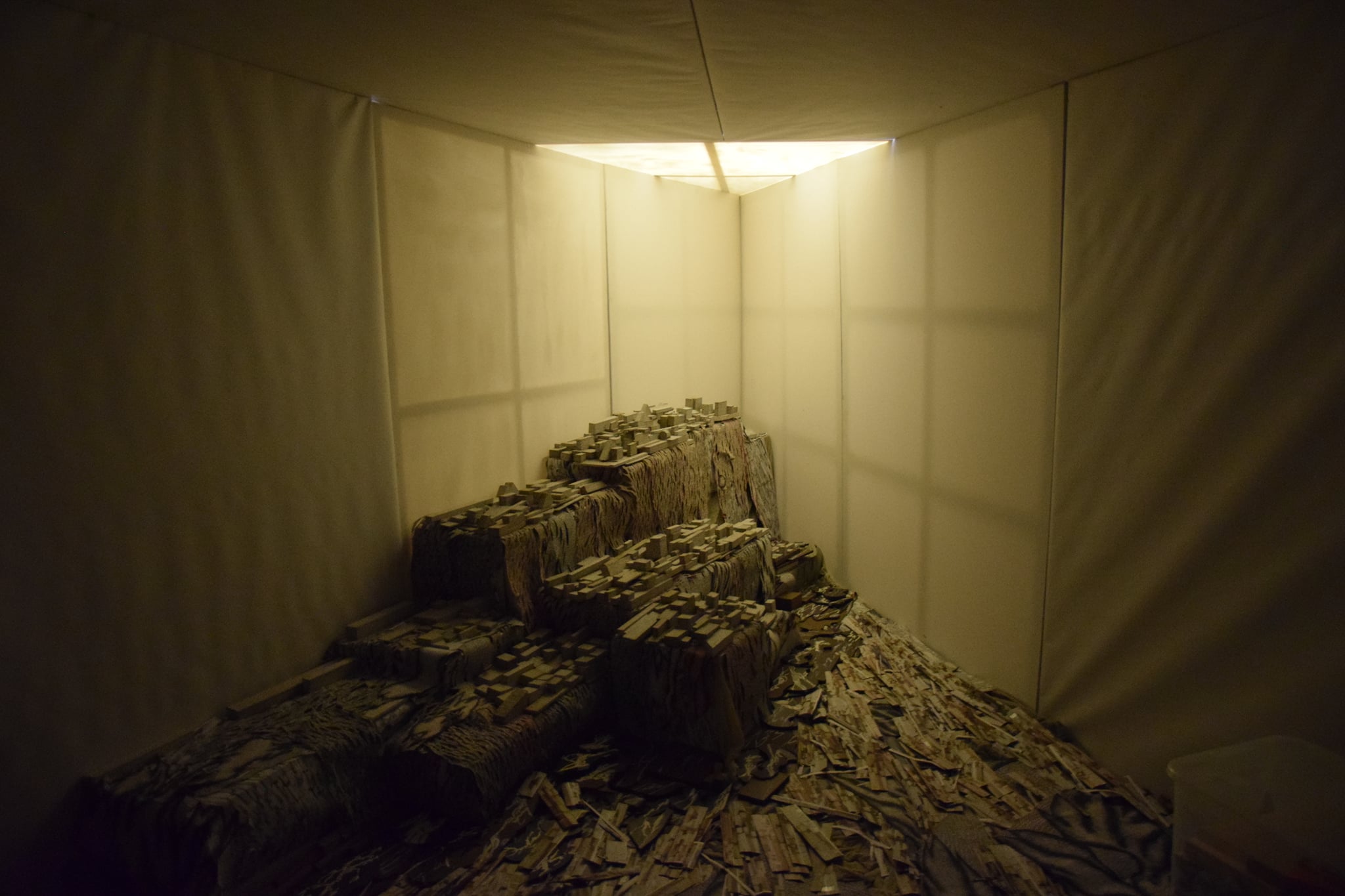 By arranging various fragments such as pieces of canvas, slats, plastic, paper and other, often waste, line-drawn materials, Gordana Bakić achieves a visual movement of work towards the viewer whose perception she subtly plays with. The artist stores elements of the work like fragile parts of personal memory, and by reusing these building materials in different circumstances, their recontextualization is achieved, while opening to the fluidity of interpretation. The author continuously re-examines space, physical and mental, creating almost surreal landscapes or, as she calls them – mental dioramas – while turning the gallery into a sliding determinant between an exhibition and work space. The combination of an ambient installation and a spacious drawing gives an insight into the intuitive creative flow of the author who, in complete contrast to the hectic way of life and work, patiently like a weaver, arranges meticulous elements creating a monumental balanced whole. In the previously realized works (Regeneration, Current Spaces, City Iconography II 1950-2000+, City Visions), but also in the materials she uses, the author’s experience of working as a theater set designer is recognized. With a deep understanding of space, evident also through the subtle fusion of light and shadow, and a balanced gradation of materials, she achieves a cohesion of work with the environment, while giving the impression of a theater stage moving. The specificity of Gordana Bakić’s work is manifested in its transformativeness, through different meanings, but also through the spatial ability of constant biomorphic adaptation to the environment in which it is located and slowly takes over, while her role is intertwined between artist and builder of magical worlds.