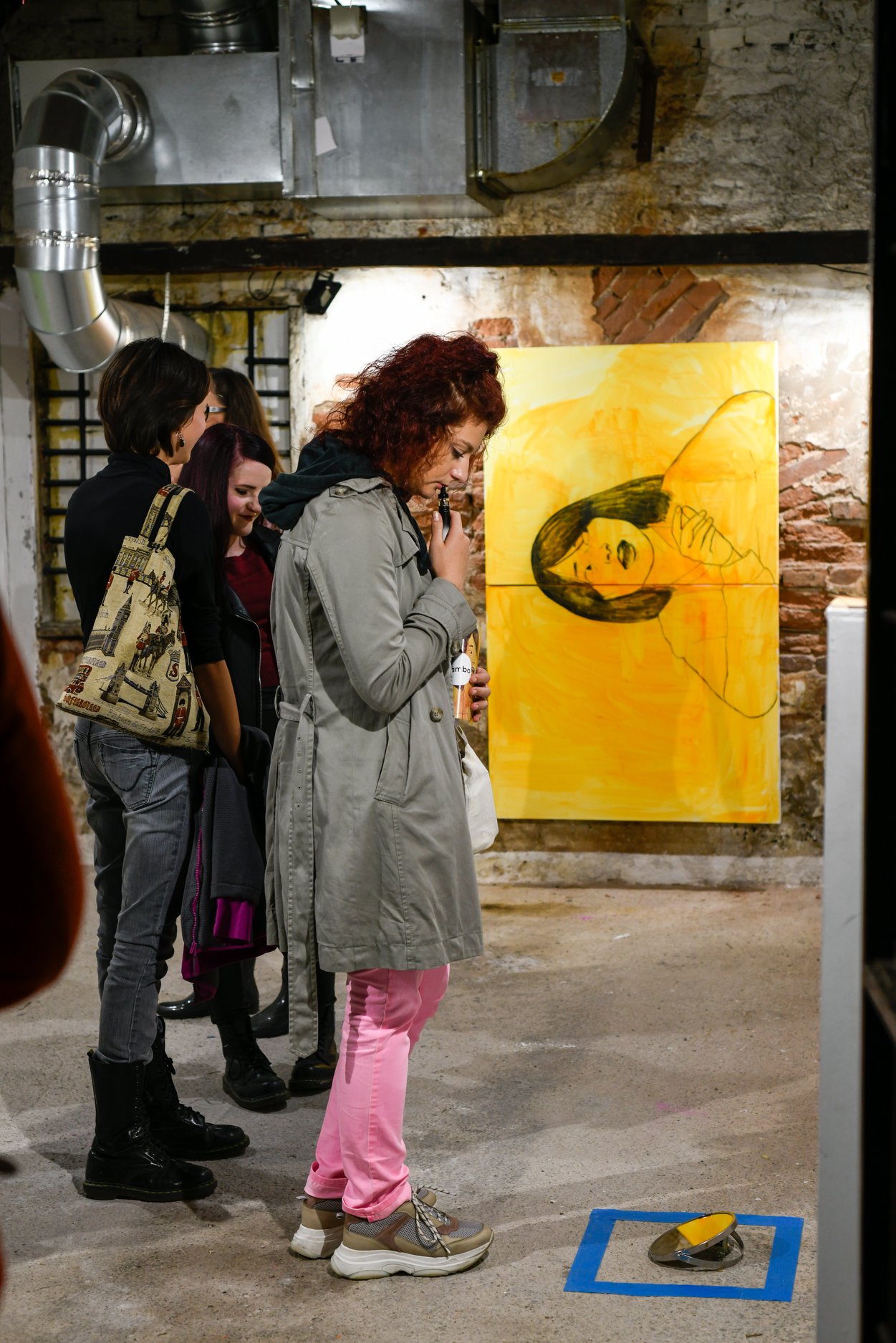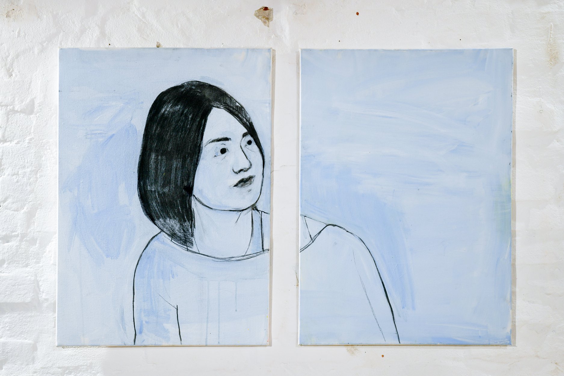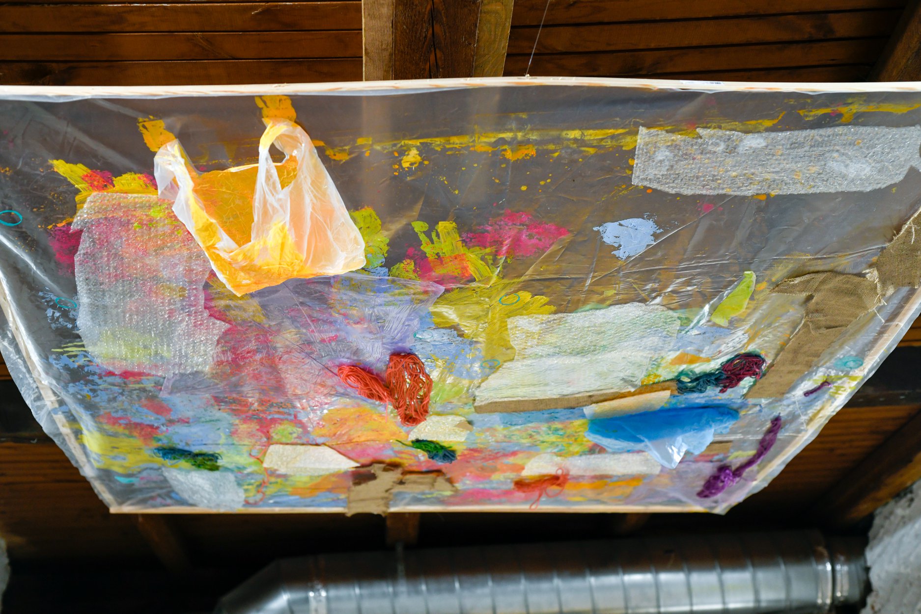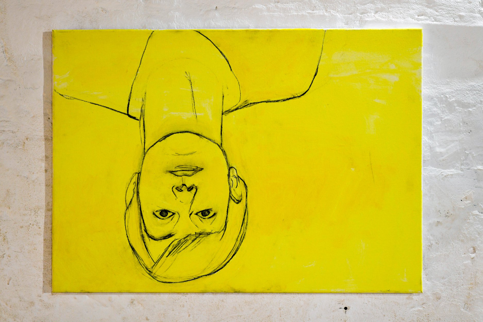 While walking daily through the Britanac Square, the author came across the thought of Goran Trbuljak from his then-current exhibition at MMSU in Rijeka: Hundreds of viewers are currently looking in the wrong direction, only you are looking in the right one. This thought, in addition to her previous considerations, raised a number of questions: Looking right? What does this entail? Is my view of things correct? With this in mind, the author decided to encourage the observer to try to change the established pattern of perception, dealing with the idea of how to approach everyday life in a new way. In the installation of Point of View by Iris Poljan, the starting point is the idea of communication by looking, in which the author creates a rhythm that directs the perceptual flows of the observer using the gallery space and linear drawings on monochrome canvases. It puts them in the context of questions, stimuli (A), which expect the observer to respond (B) in the form of writing down what was observed, creating dynamism A-B-A-B, and directing the final view towards the abstract composition of the garage ceiling.