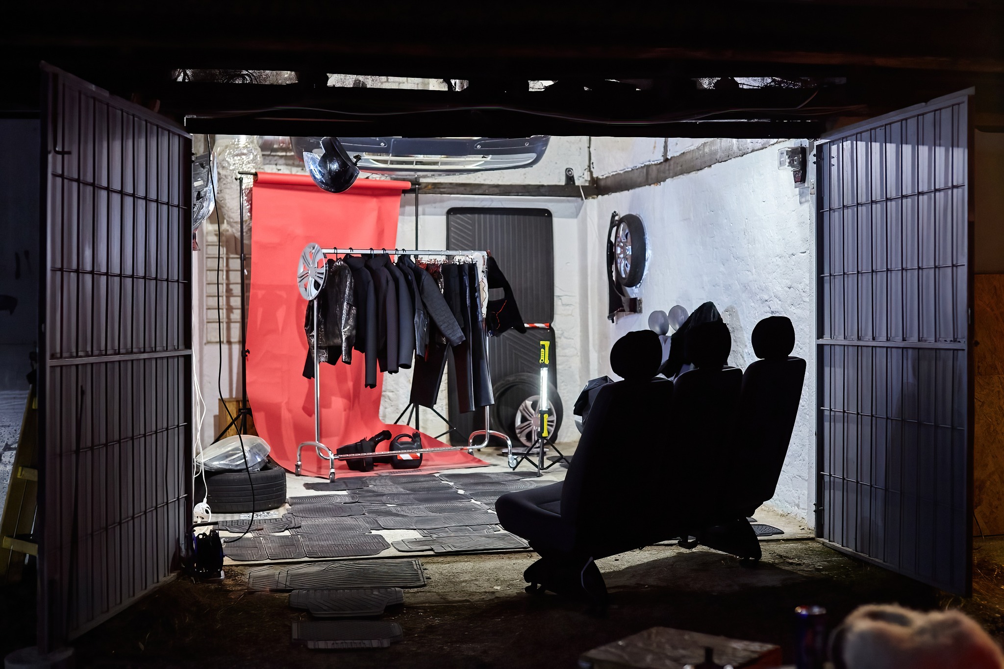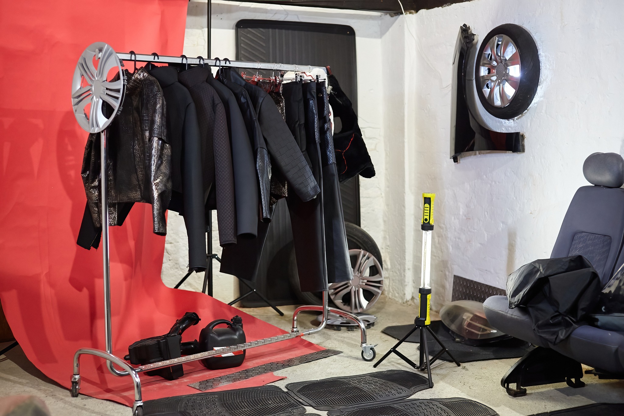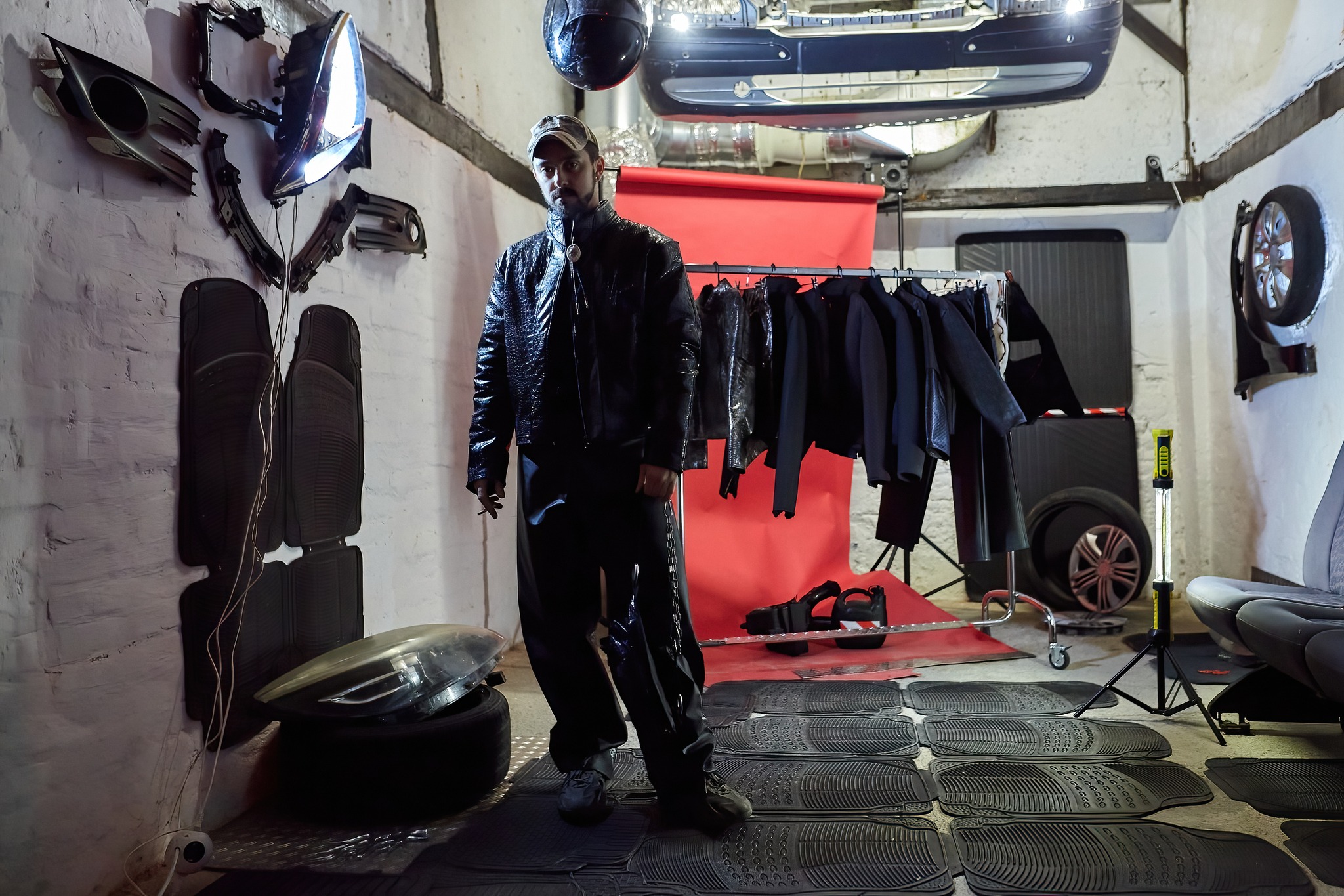 When a deer halts in front of a vehicle, the one thing that hypnotizes it through uncertainty and fatally attracts it are headlights. Contrary, in Robert Fenrich’s case the object of fascination becomes the interior and atypical materials inside of cars, things that many experience through touch, but cannot say they overly notice or think about them extensively. Whilst modes of transport are meant to take us to a known or deliberate destination, this exhibition, which is forebodingly named SPEED LIMIT 69, lays emphasis on the speed of the journey that is taking spectators into uncharted waters with the help of their familiarity with materials. The observer appears to be caught up in a well-known, yet unknown and difficult, situation; as in a Lynchian movie, the focus is on the simultaneous duality of Fenrich’s works, which are artwork and item of clothing in one – hence they are sculptures in the form of atypical materials and also garments in the form of already experienced textile compositions. Robert’s interest in the textiles of car seats and various other materials inside of cars, led him towards producing his own avant-garde fashion line with the goal of wearability, unlike high fashion pieces that are typically unwearable. The first step in humanizing these avant-garde garments was taken during its prelude exhibition within the curatorial collective KUĆĆA and was executed by 6 performers dressed in specific statement pieces, during which the actors’ unwearability and dehumanization were more in the forefront; models turned into moving dolls, pieces of clothing wore them and not vice-versa.