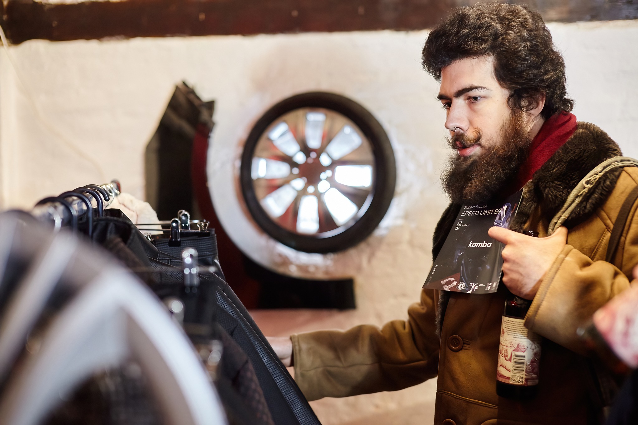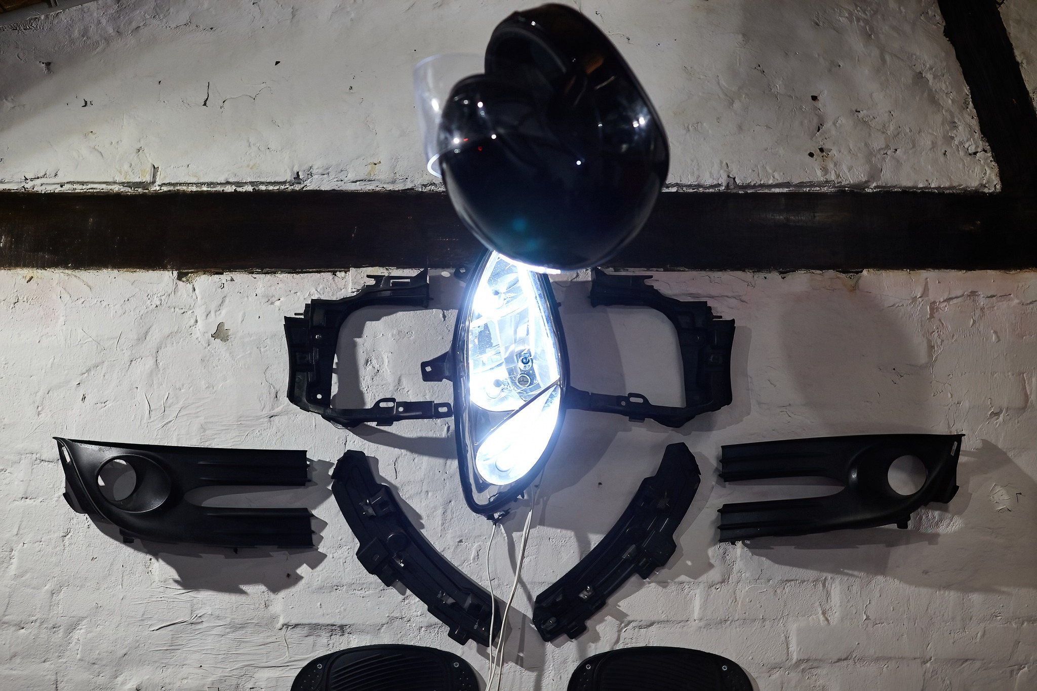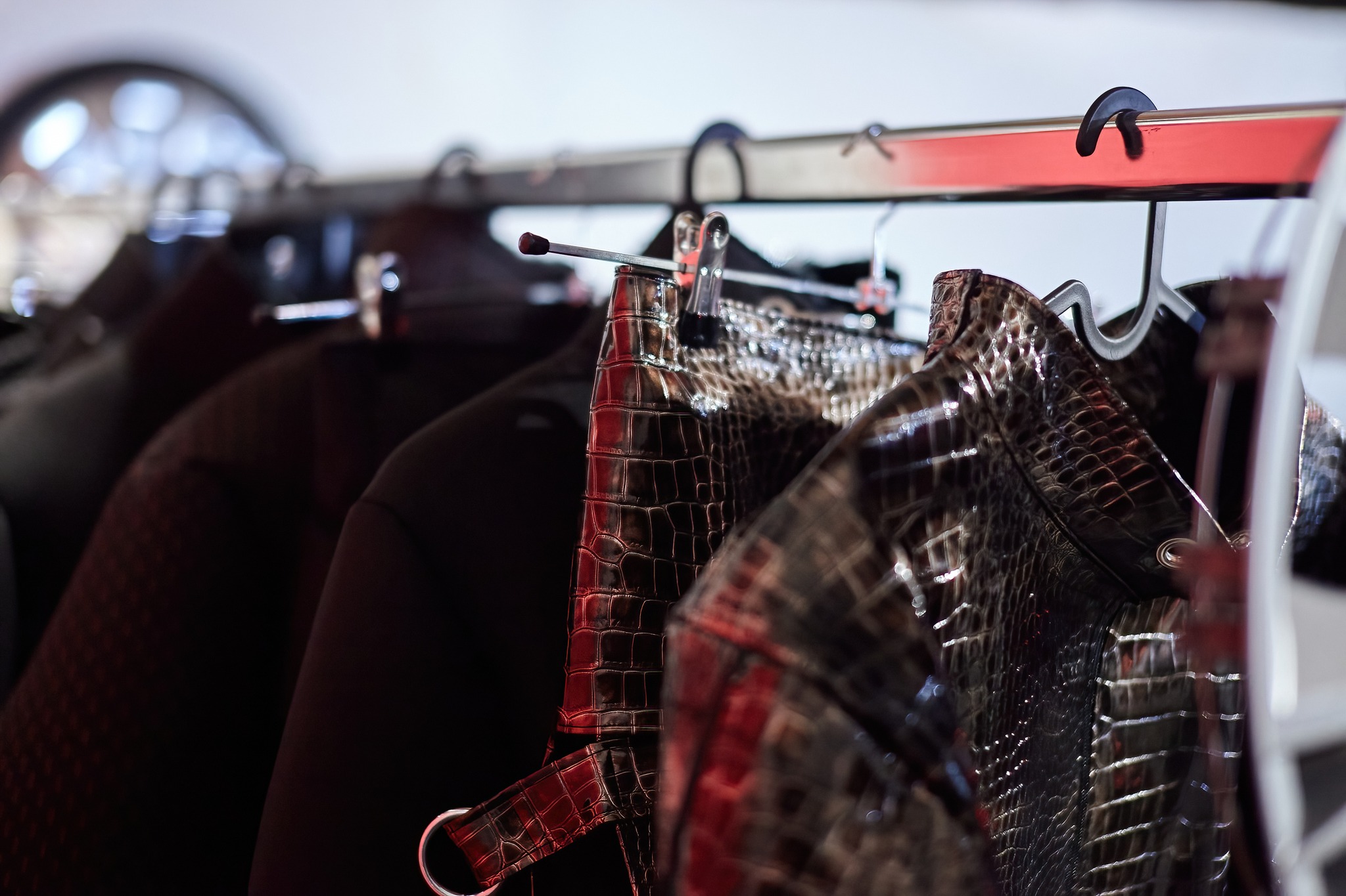 When a deer halts in front of a vehicle, the one thing that hypnotizes it through uncertainty and fatally attracts it are headlights. Contrary, in Robert Fenrich’s case the object of fascination becomes the interior and atypical materials inside of cars, things that many experience through touch, but cannot say they overly notice or think about them extensively. Whilst modes of transport are meant to take us to a known or deliberate destination, this exhibition, which is forebodingly named SPEED LIMIT 69, lays emphasis on the speed of the journey that is taking spectators into uncharted waters with the help of their familiarity with materials. The observer appears to be caught up in a well-known, yet unknown and difficult, situation; as in a Lynchian movie, the focus is on the simultaneous duality of Fenrich’s works, which are artwork and item of clothing in one – hence they are sculptures in the form of atypical materials and also garments in the form of already experienced textile compositions. Robert’s interest in the textiles of car seats and various other materials inside of cars, led him towards producing his own avant-garde fashion line with the goal of wearability, unlike high fashion pieces that are typically unwearable. The first step in humanizing these avant-garde garments was taken during its prelude exhibition within the curatorial collective KUĆĆA and was executed by 6 performers dressed in specific statement pieces, during which the actors’ unwearability and dehumanization were more in the forefront; models turned into moving dolls, pieces of clothing wore them and not vice-versa.