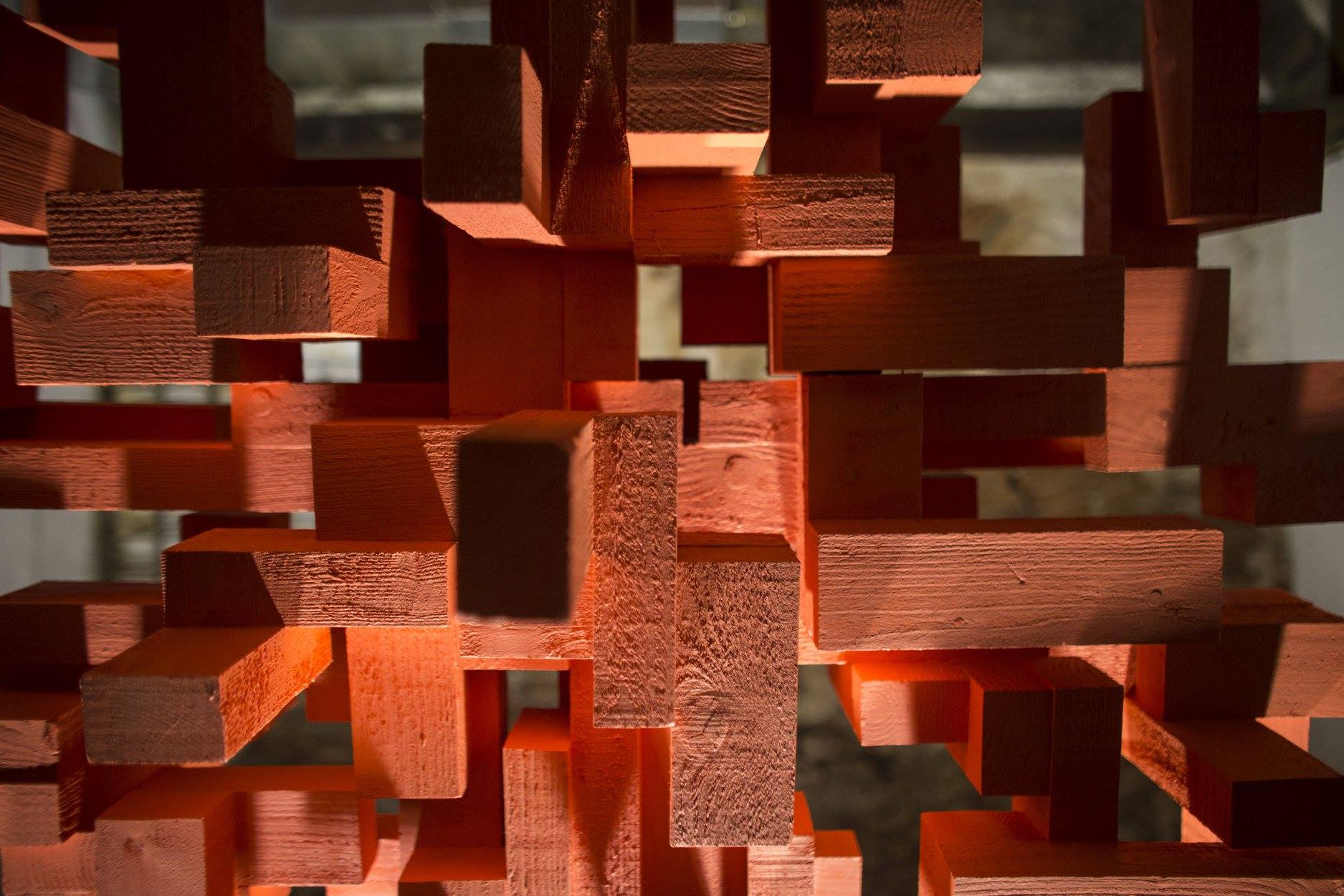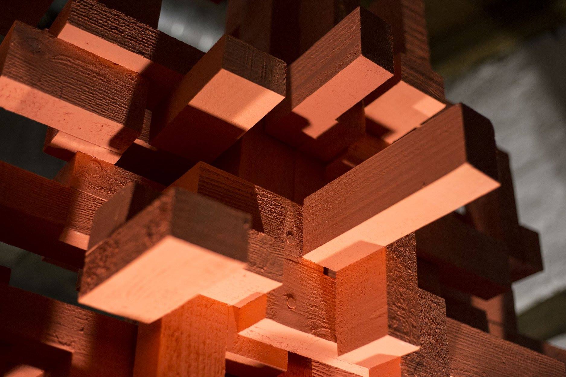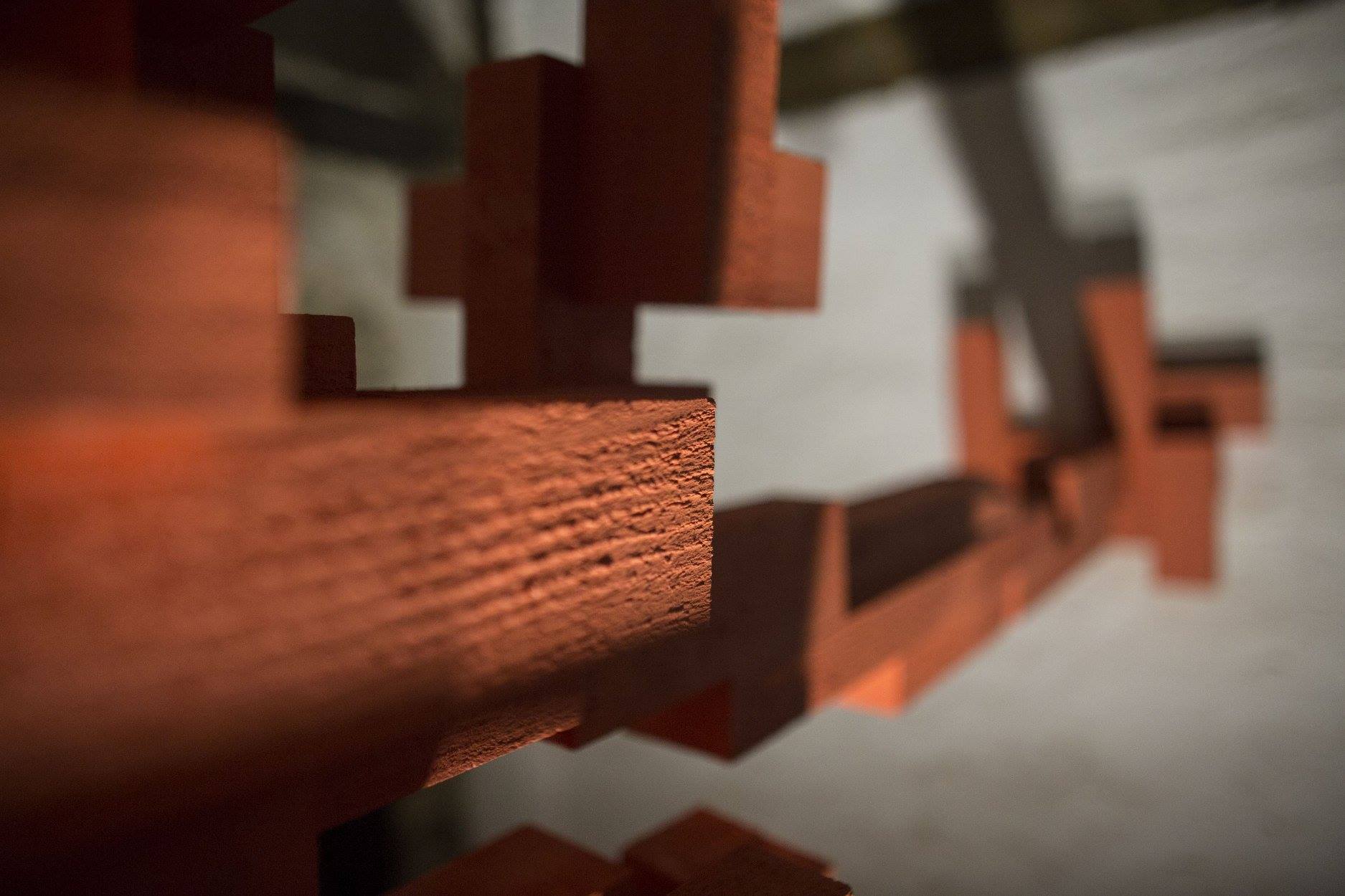 The exhibition Stega by Sanjin Vinković modularly arranges cubic wooden elements joined at right angles, which, by branching their forms, pave paths for new elements to join. This concept is inspired by encounters with wooden IQ puzzles—separate pieces that unite into a whole, their integrity fragile, and their assembly/disassembly dependent on logical principles of the folds in the brain’s cortex. The functionality of such wooden objects lies in their purpose for play and contemplation, with a context that is mathematical in nature yet artistic, while their shape and form are undeniably sculptural in their perception.