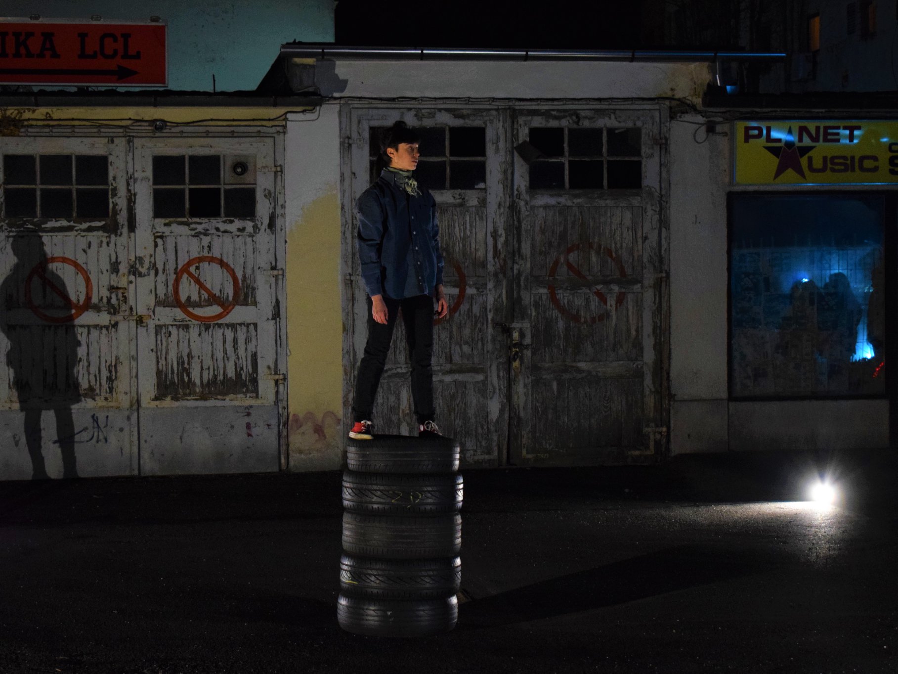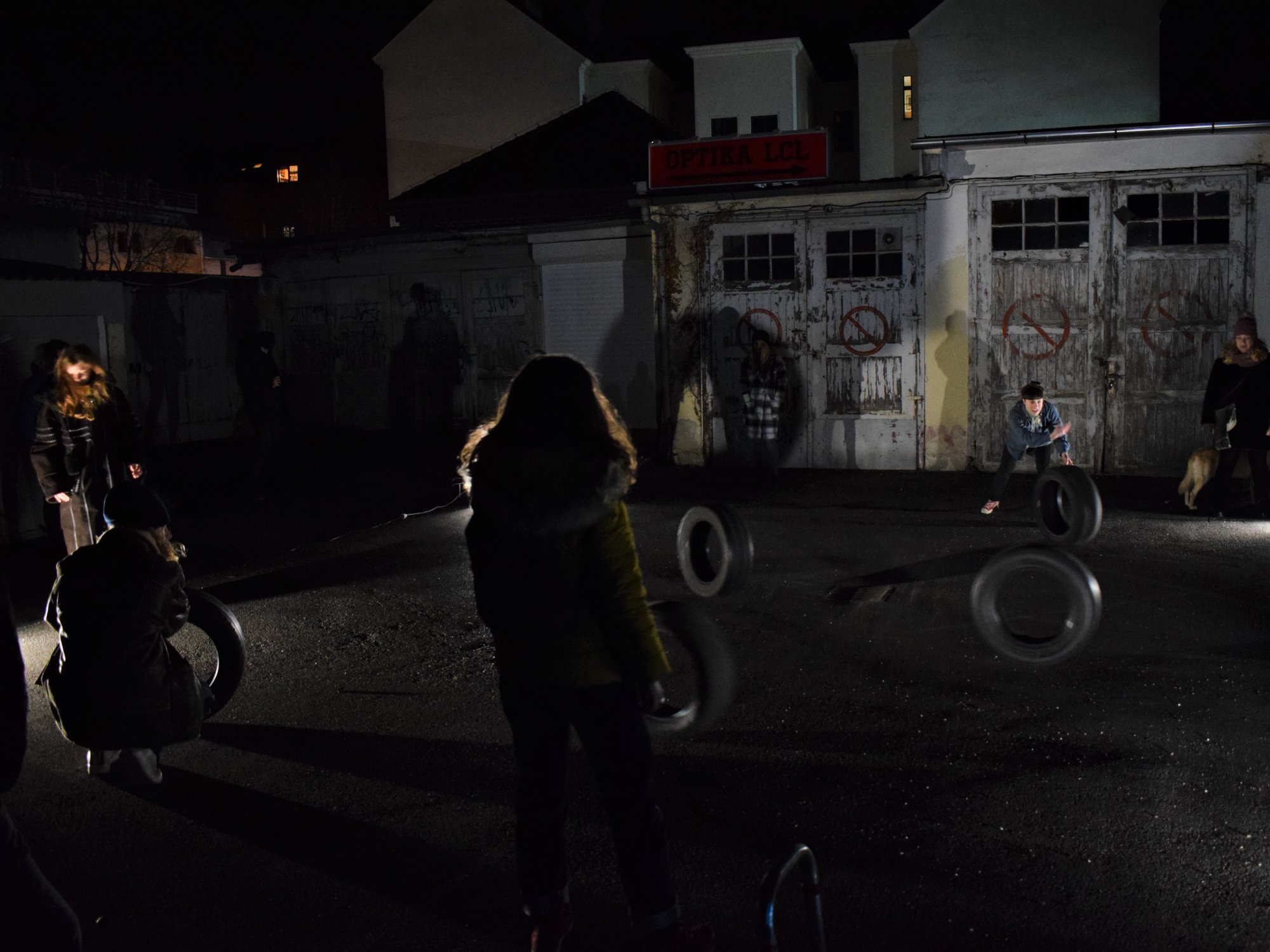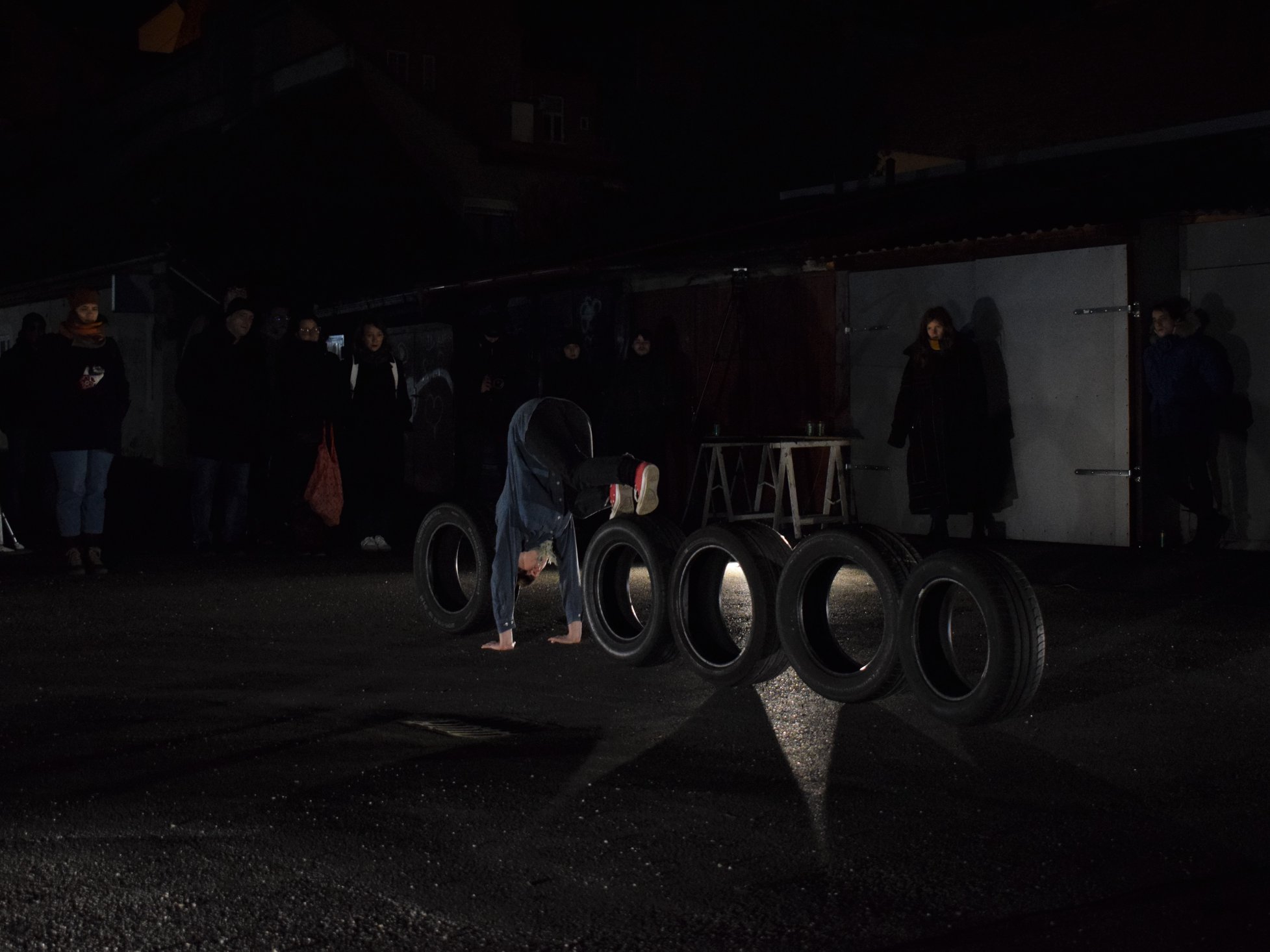 Tapping, scraping, voice, and breath in light, in darkness. Rubber wheels. Rubber, a solid elastic substance obtained by the vulcanization of natural and synthetic rubbers; a rubber tire, the one that gets my hands dirty when it cracks on the freeway away from home; what I always need but never think about. Tired out is a visual and physical participatory act by Israeli artist Darya Efrat, which questions the spontaneous moment of interaction, construction and deconstruction in creating a visual landscape and a point of reflection for performance observers/participants, combining movement, dance, and circus in a dialogue between a woman and a tire. The performance is a part of a residency in Zagreb focused on collecting, developing, processing and sharing the research process that Efrat has collected over the past year.