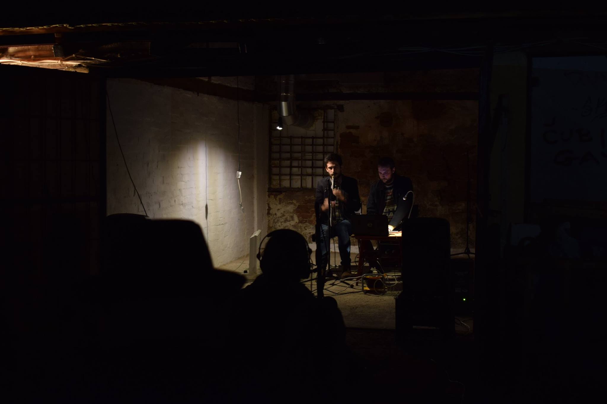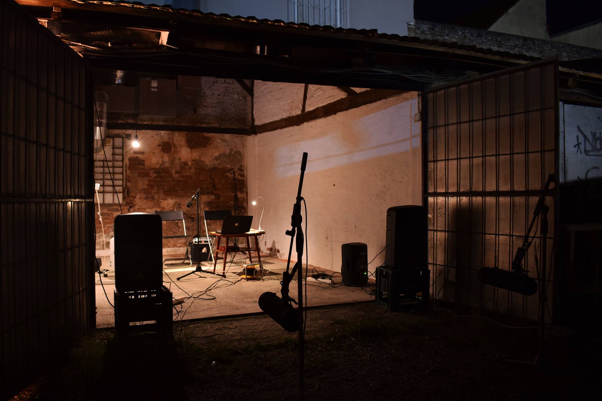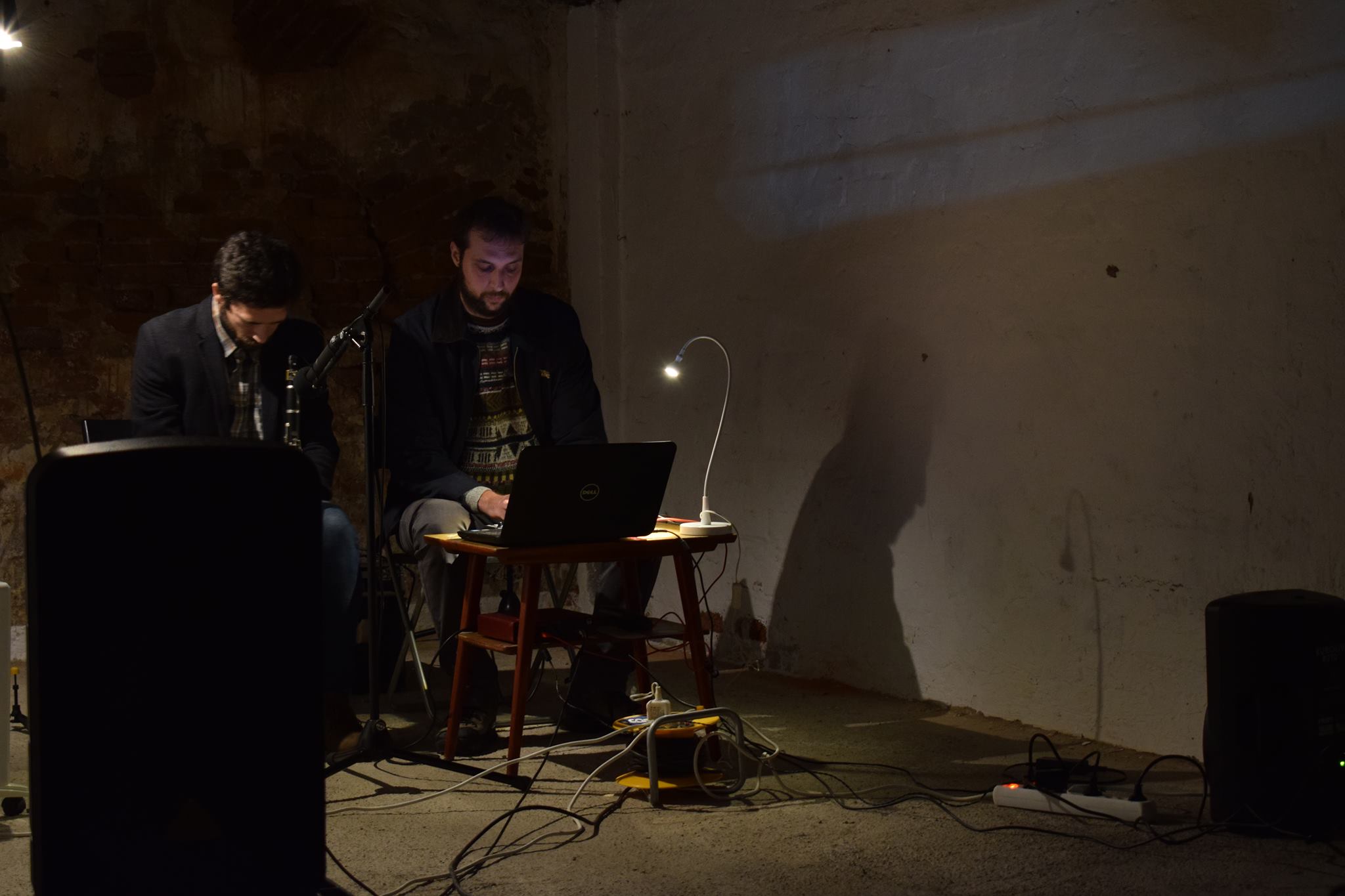 In a system of reflective pipes, cubes, and welds, the sound of rushing air is created and heard as it caresses metal walls, flowing through openings of air and sound. The performance Ventilation, Clarinet, and Loops by Group ONO combines elements of classical and electronic music, directly referencing and utilizing one of the space’s features—the sound of the garage ventilation system. By playing repetitive clarinet sequences, recording them, and reproducing them live, a minimalist composition emerges that communicates with the empty garage space. This space, with its doors mostly closed, is traversed only by air currents in ventilation, whose fluidity becomes the subject of the performance’s sound. While the ventilation system over there churns smoke and breath through the walls, murmurs, currents, and air openings on this side create sound. After all, what is sound but vibration in the air?