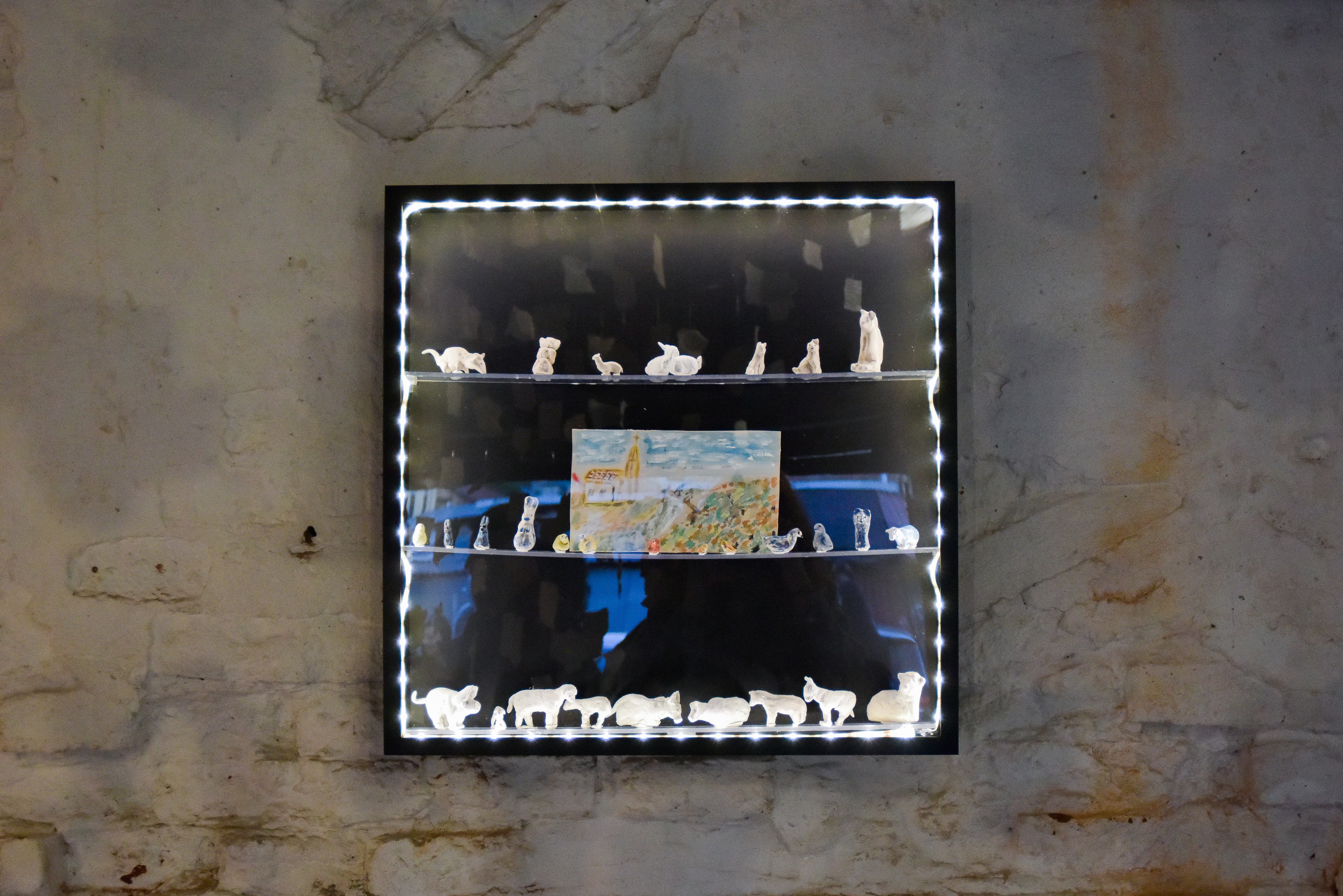 Luisa Pascu selects found ceramic tiles as the base for her paintings: utilitarian objects that evoke the poetics of the everyday, their materiality earthy and fragile. We do not know who the previous owner of the ceramics was—what private lives quietly unfolded within the tiled walls and floors?—but Luisa collects them and uses them as a foundation for honest and vulnerable depictions of her own daily life. Through shifts in perspective, she explores the relationship between the body and subjectivity, painting views of the body from angles visible only to its owner, then descending to the level of shoes. Through an investigative approach to figuration, the artist becomes aware of her own body in space, the space it occupies, and the external gaze that lands upon it.