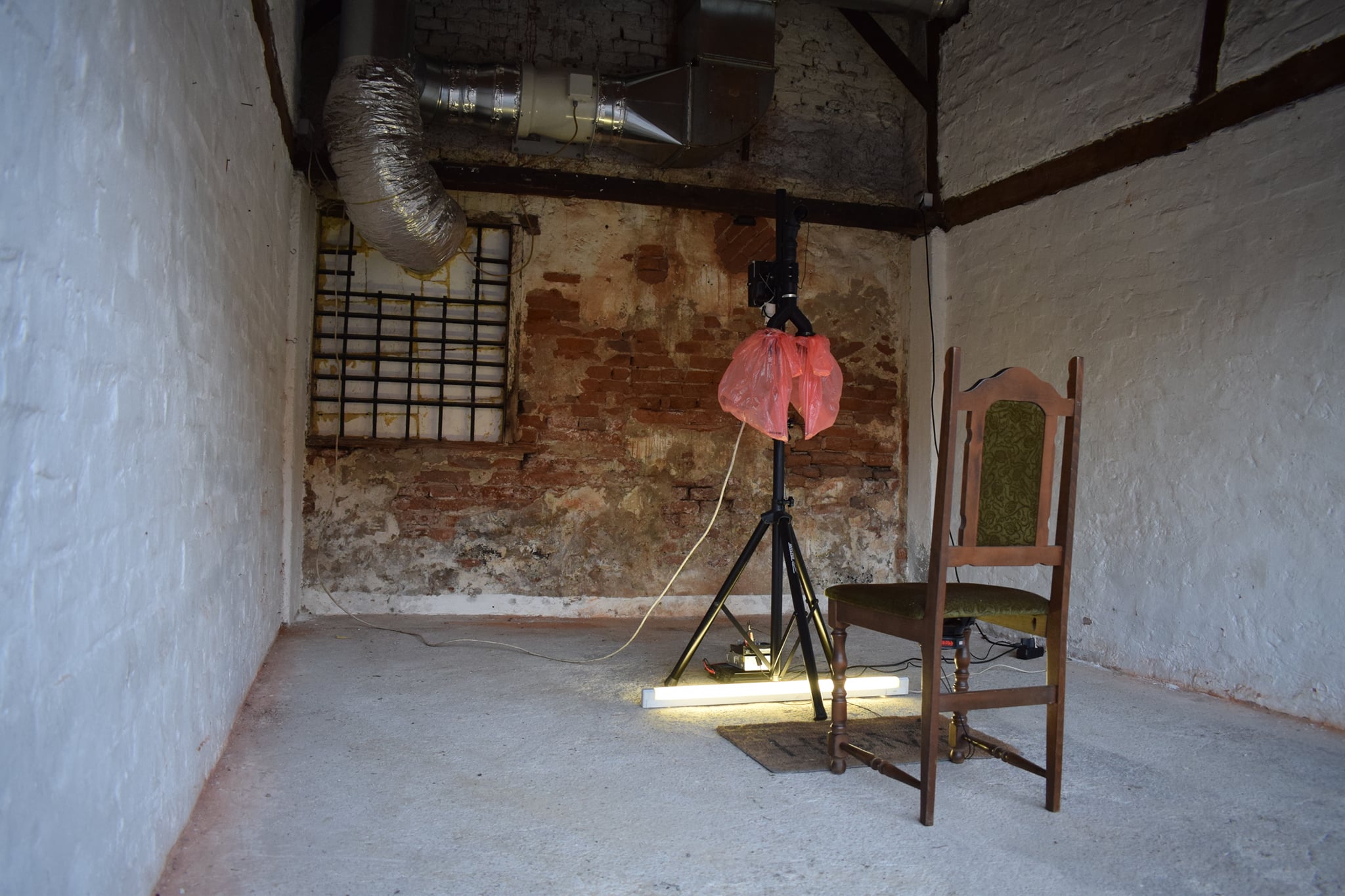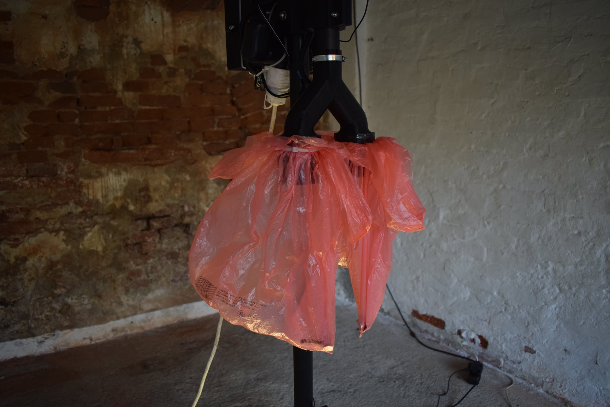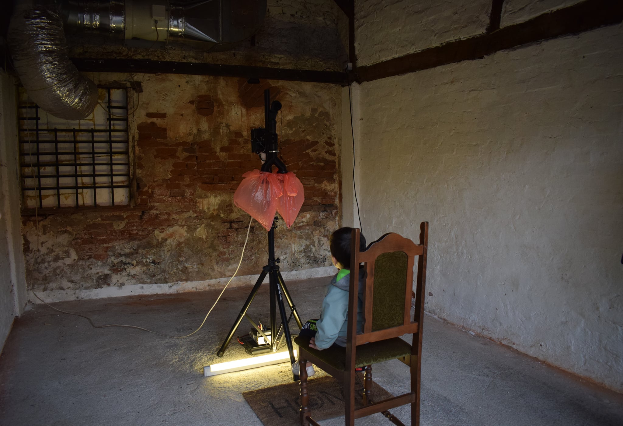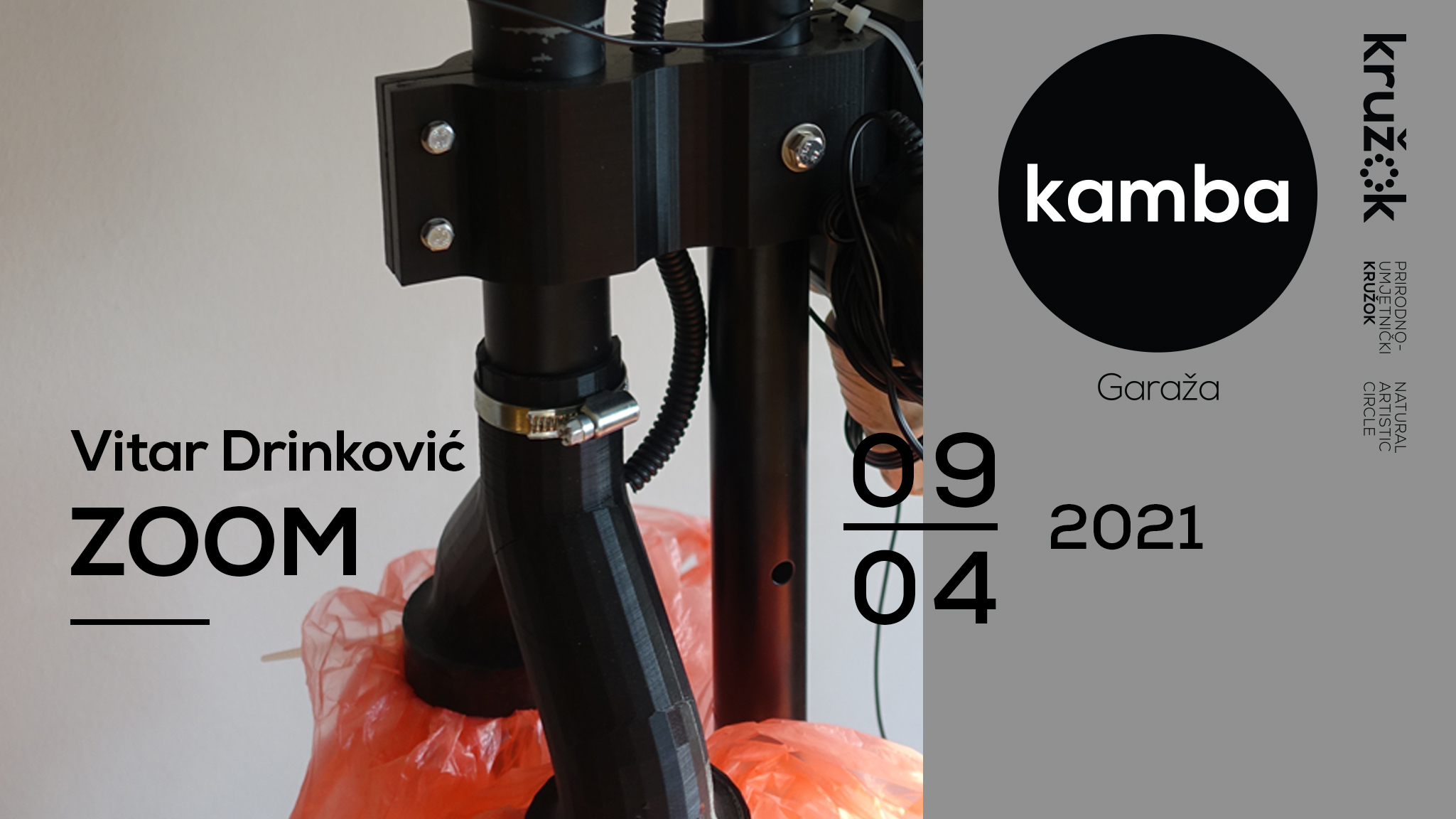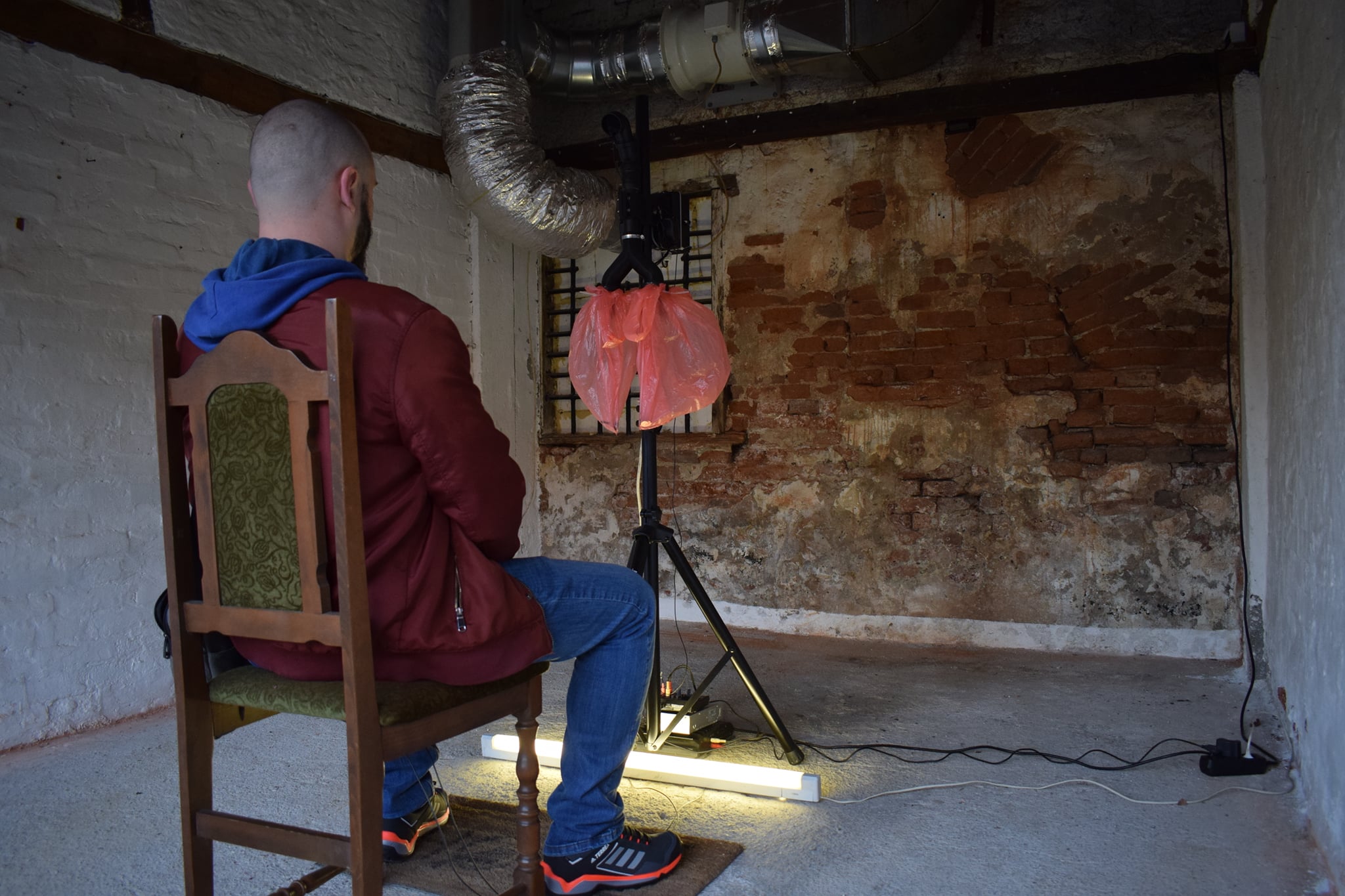 Interactive installation ZOOM by Vitar Drinković reflects on the effects and changes that the last year has left on the individual, but also on the collective psyche. The observer enters this experiential installation physically, sits on a wooden chair in front of a construct made of 3D printed parts, an electric motor, a microphone and two plastic bags that evoke human lungs, sitting on the trembling wooden chair, while the breath of this proto-cyborg creature flows over his face. True to his recognizable artistic approach, in Drinković’s work man is truly the measure of all things, but the world inhabited by his miraculous machines tends towards a transhumanist inception, in which he questions with a healthy dose of criticism what it means to be human, where the health and sanity congregate, in a productionally complex, and presentationally simple manner he confronts us with the fears, anxieties, and turmoils that have been the weavers of the unrest of our most recent days. Every element of the installation: plastic bags which are “breathing”, air currents on the face, distance of the apparatus from the observer (1.5 m!), and vibrations of the chair caused by the air flow have a direct connection with the situation we are in, both locally and globally.